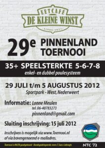 Dit jaar wordt het Pinnenland Toernooi van N.T.C. ’72 gehouden van 29 juli t’m 5 augustus 2012. Het toernooi is voor 35+ spelers met een speelsterkte van 5-6-7-8. Deelnemers kunnen zich aanmelden voor dit gezellige toernooi op www.toernooi.nl. Net als vorig jaar wordt dit toernooi mede mogelijk gemaakt door Eetcafé De Kleine Winst.