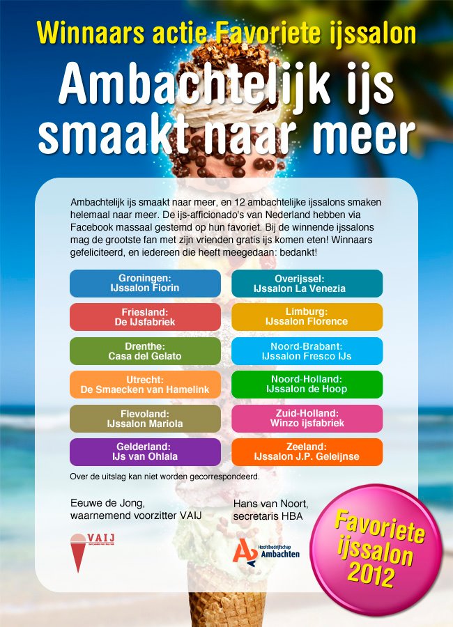 Ambachtelijk ijs smaakt naar meer, en 12 ambachtelijke ijssalons smaken helemaal naar meer. De ijs-afficionado’s van Nederland hebben via Facebook massaal gestemd op hun favoriet. Ijssalon Florence in Nederweert is de meest favoriete ijssalon van Limburg geworden. Bij de winnende ijssalons mag de grootste fan met zijn vrienden gratis ijs komen eten! Winnaars gefeliciteerd.