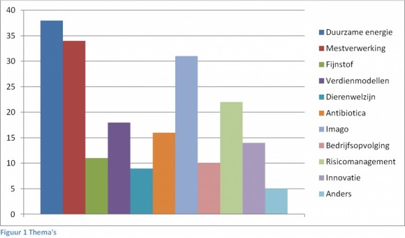 Wanneer men kijkt naar bovenstaande tabel, ziet men dat ‘Duurzame energie’ en ‘Mestverwerking’ thema’s zijn volgens de agrariërs. Ook de maatschappelijke functie van de boerderij wordt als interessant bestempeld. Als men kijkt naar de fijnstof problematiek zijn dit voornamelijk bedrijven in de gemeentes Nederweert en Weert die dit interessant vinden, in Leudal en Cranendonck zijn deze thema’s minder relevant. Risicomanagement en termijnmarkten is ook een thema wat voornamelijk in de gemeente Nederweert als interessant wordt bestempeld.
