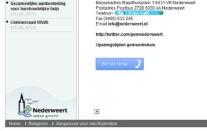 De gemeente Nederweert is constant bezig met het verbeteren van de dienstverlening. Dat gebeurt in grote, maar ook in kleine stappen. Een voorbeeld van zo’n kleine stap is het plaatsen van een ‘bel mij terug-knop’ op de website www.nederweert.nl. Via deze knop kunnen bezoekers hun gegevens achterlaten waarna ze binnen twee werkdagen worden gebeld. Service op maat, want zo weten ze precies welke vragen je hebt en kunnen ze u dus ook meestal meteen een antwoord geven.