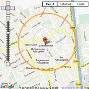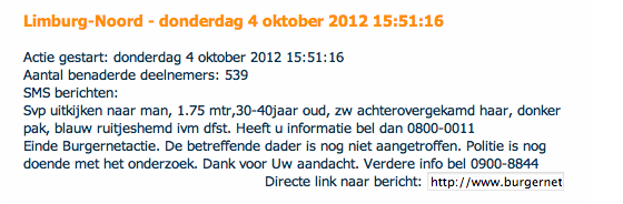 Naar aanleiding van deze melding zijn er wat vragen ontstaan omdat niet iedereen dit smsje heeft ontvangen. Navraag leert dat zo een melding standaard in een straal van 500 meter wordt uitgestuurd (zie kaartje). De reikwijdte kan door de centralist worden vergroot, afhankelijk van de melding.