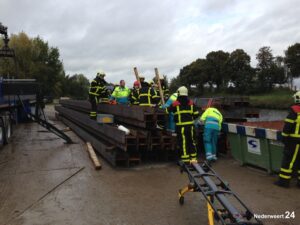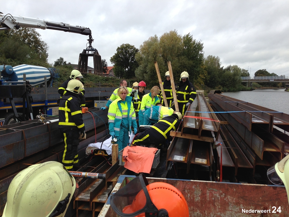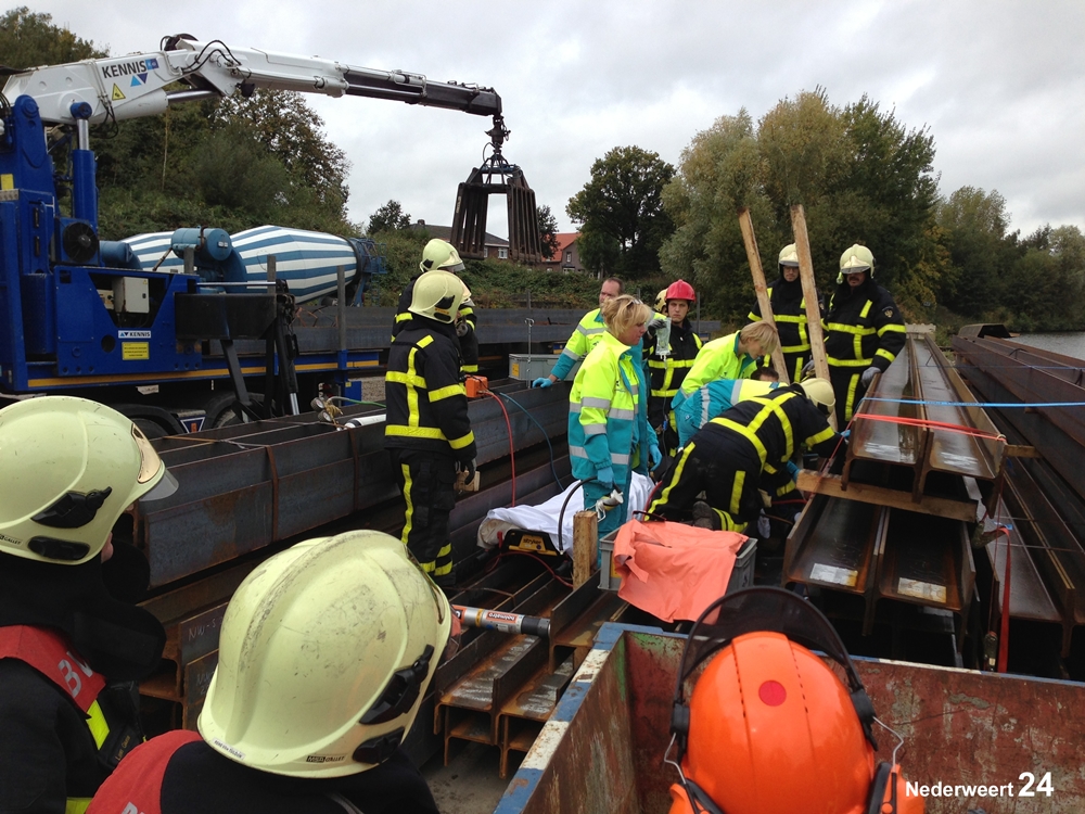 Bij aankomst bleek dat bij het laden van grote stalen balken iemand met zijn voet tussen 2 balken was gekomen. De brandweer kon de balken weghalen en het slachtoffer bevrijden. Het slachtoffer werd afgevoerd naar het ziekenhuis in Weert. Over de aard van zijn verwondingen konden de hulpverleners nog niks zeggen.