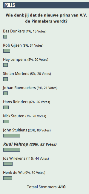 De lezers van Nederweert24 hebben de afgelopen weken kunnen raden wie zij denken dat de nieuwe Prins voor het komende vastelaovundjs-seizoen zal worden. De meeste lezers verwachten dat Rudi Veltrop het zal worden. Rudi heeft met 83 stemmen van de in totaal 410 uitgebrachte stemmen net 3 stemmen meer dan John Stultiens. Op de derde plaatst staat Jos Willekens met 44 stemmen.