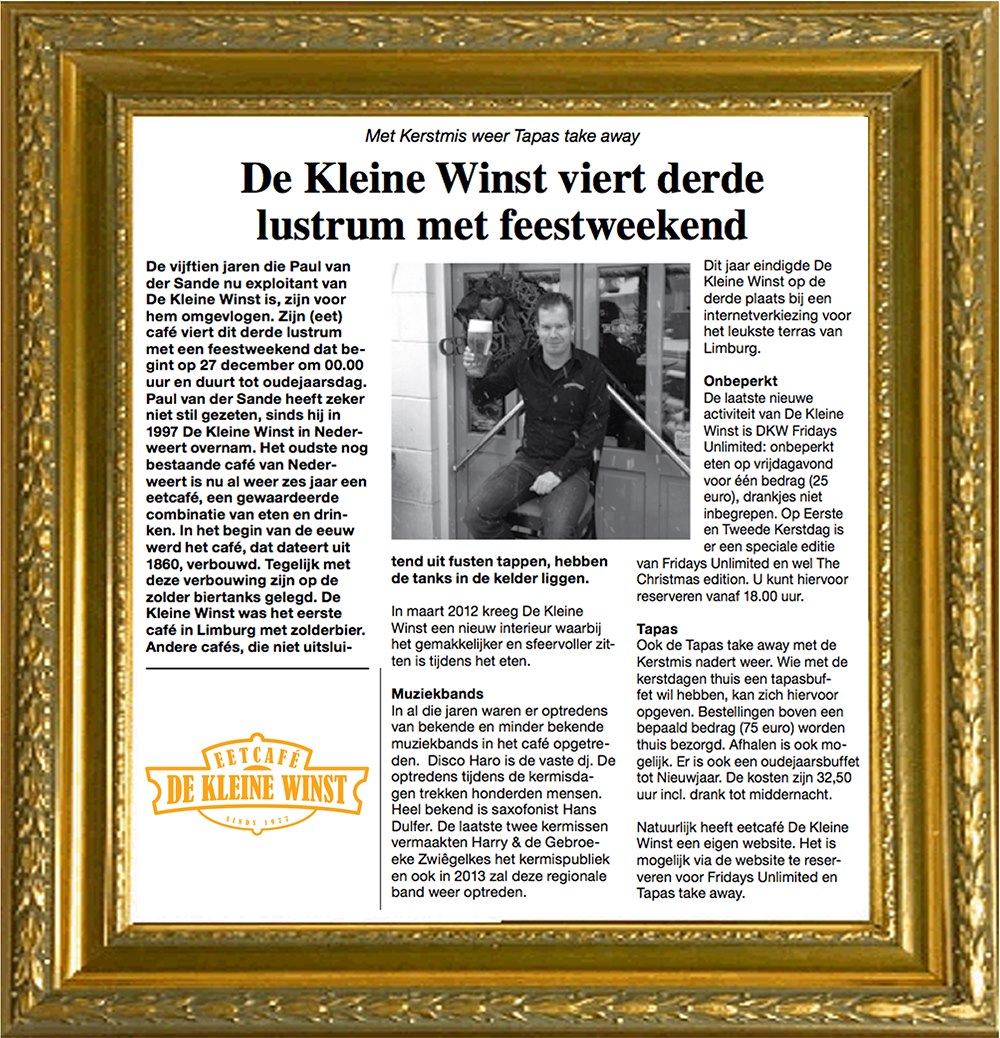 Een lang gekoesterde wens van Paul van der Sande is eindelijk in vervulling gegaan: “met een glasbier in de hand op de voorpagina van het Weekblad voor Nederweert“. Allemaal ter ere van zijn derde lustrum als uitbater van Eetcafé De Kleine Winst. Paul staat al weer 15 jaar met veel plezier in het oudste, nog bestaande, café van Nederweert.
