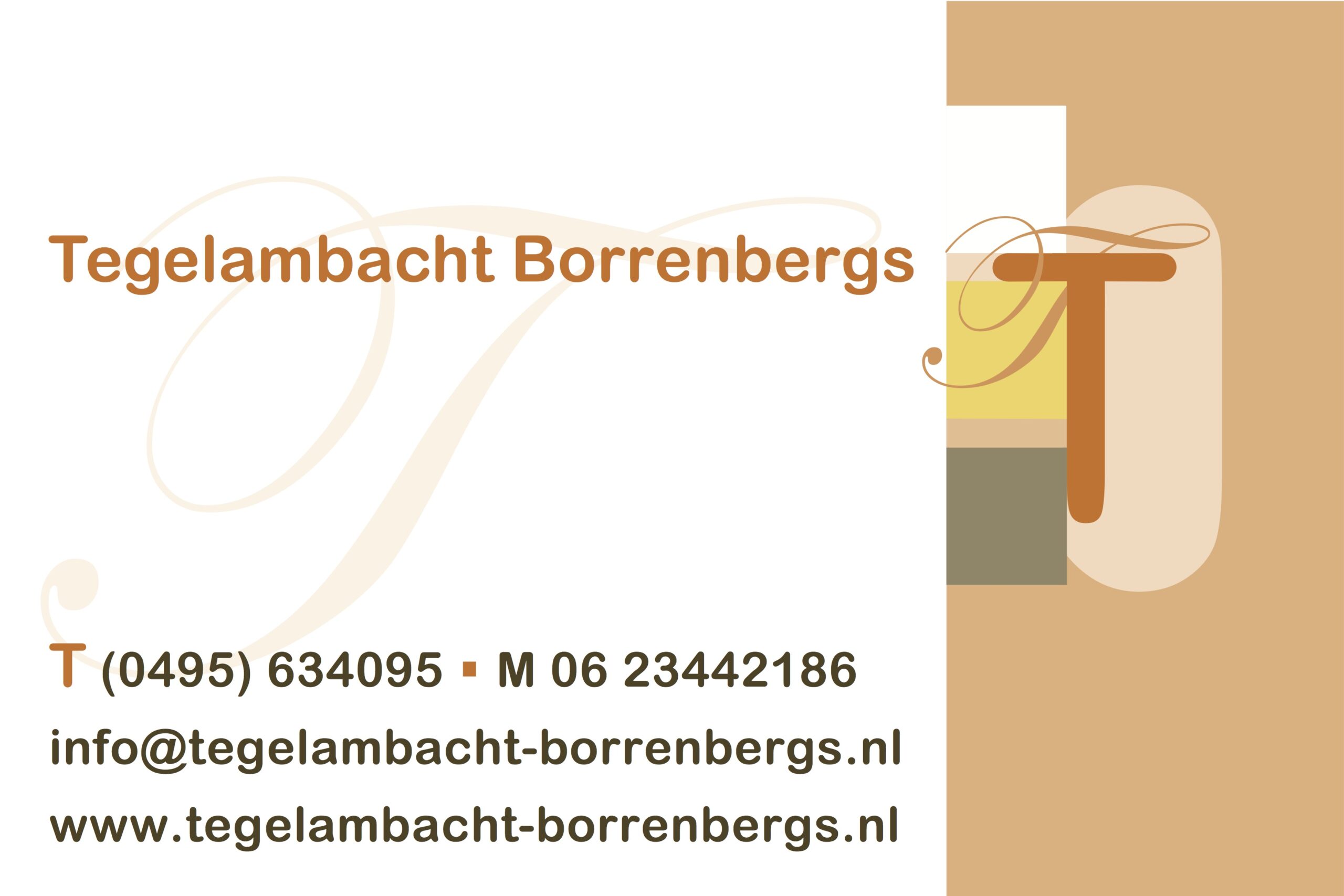 Ton Borrenbergs is met zijn ruim twintig jaar ervaring op het gebied van tegelwerk, eigenaar van Tegelambacht Borrenbergs. Ze houden zich bezig met het afwerken van vloeren en wanden met steenachtige materialen zoals tegels, natuursteen en mozaïek. Er worden tegels geplaatst in allerlei variaties zowel nieuwbouw als renovatie. Daarbij wordt gebruik gemaakt van verschillende soorten lijmen en species.