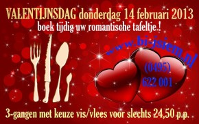 Donderdagavond 14 februari 2013 is het weer Valentijnsdag. Om deze dag een speciaal tintje te geven kun je bij Restaurant Bi-j Siem terecht voor een romantisch Valentijs-diner.