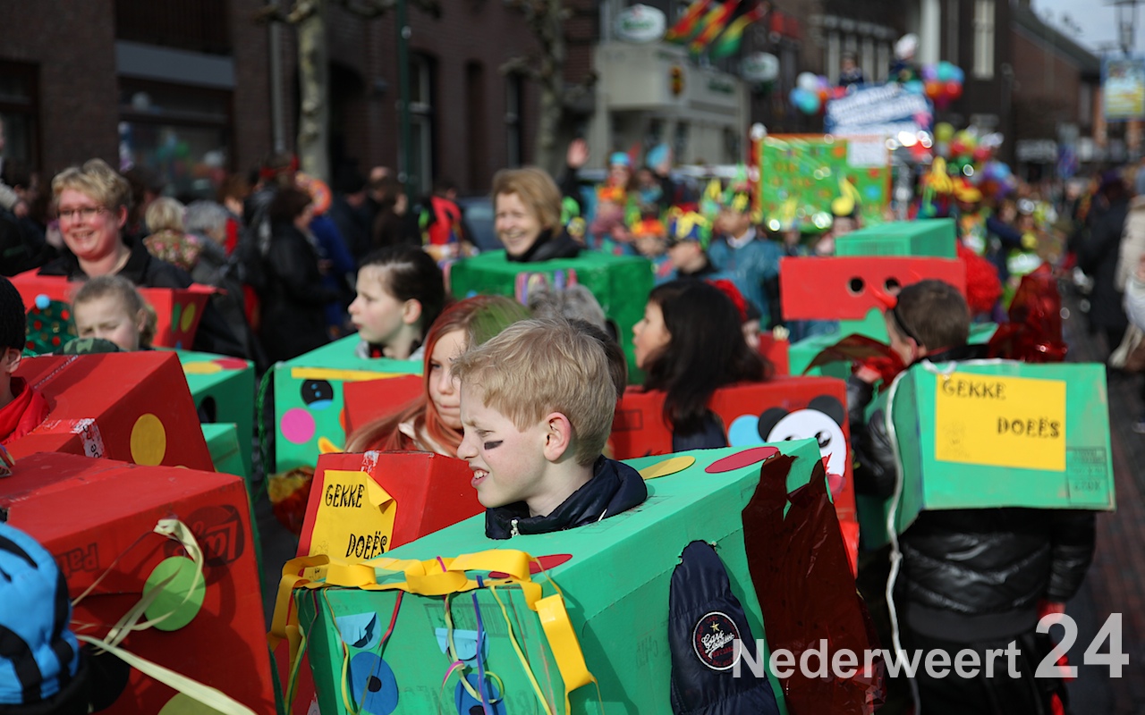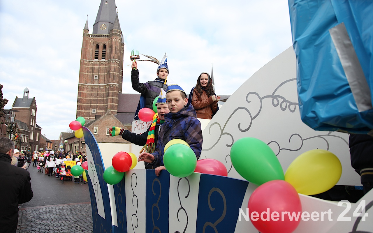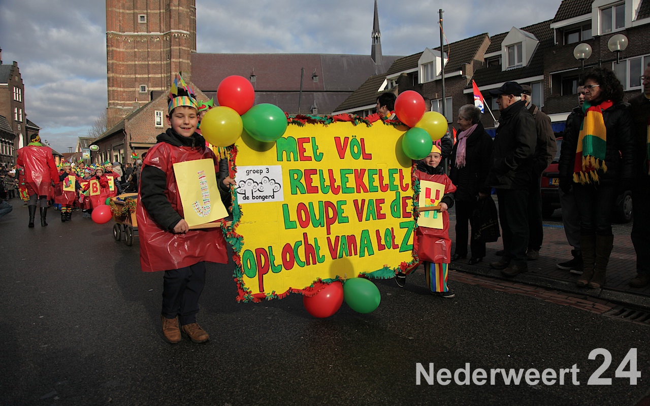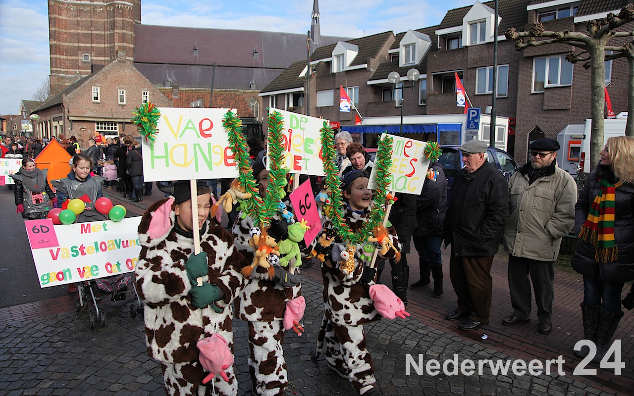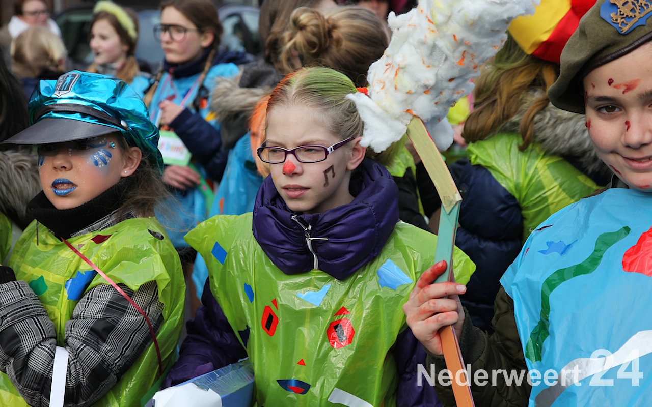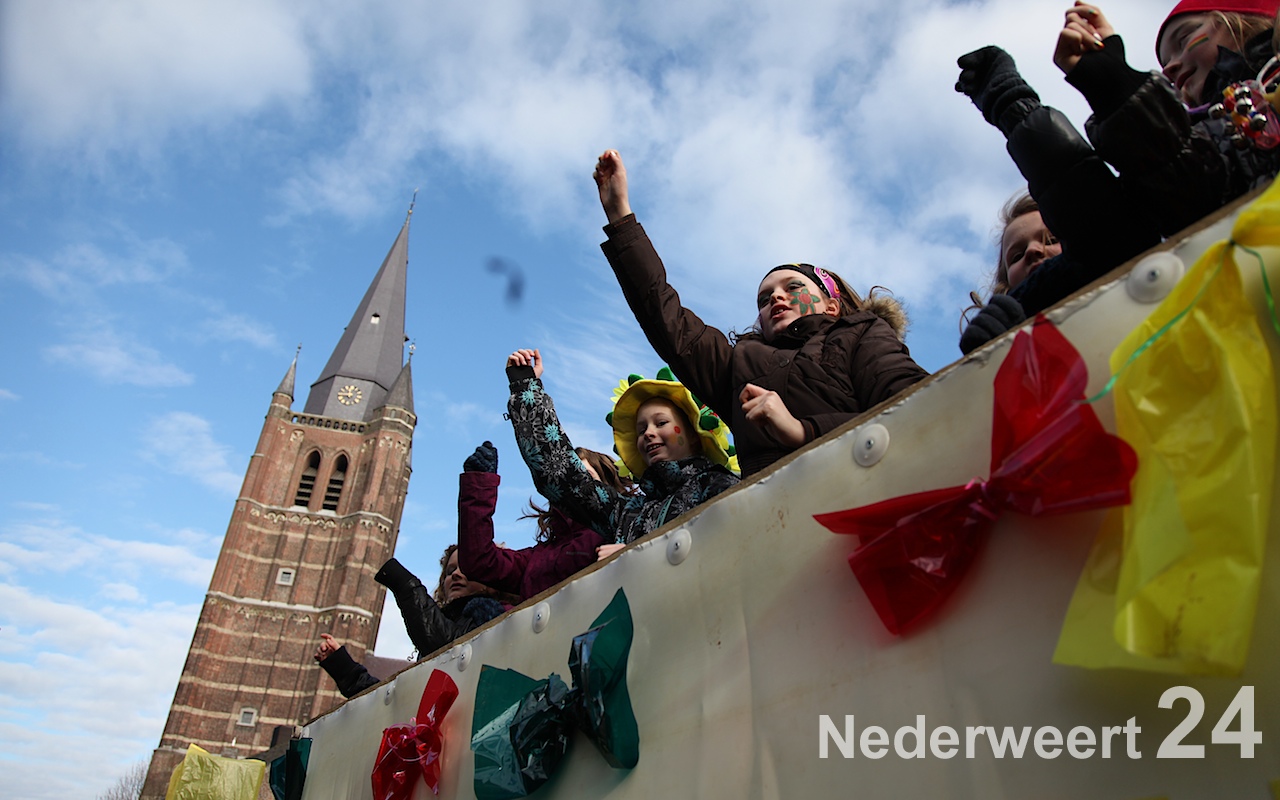 Alle kinderen van de basisscholen van Nederweert; BS Budschop, BS de Bongerd, BS de Klimop en BS de Kerneel, zijn vanmorgen door de straten van Nederweert getrokken. De kinderen hadden de prachtigste creaties gemaakt. Grote wagens voor de prinsenparen, kleine wagens voor de peuters en grote groepen uitgedost in prachtige kleuren.