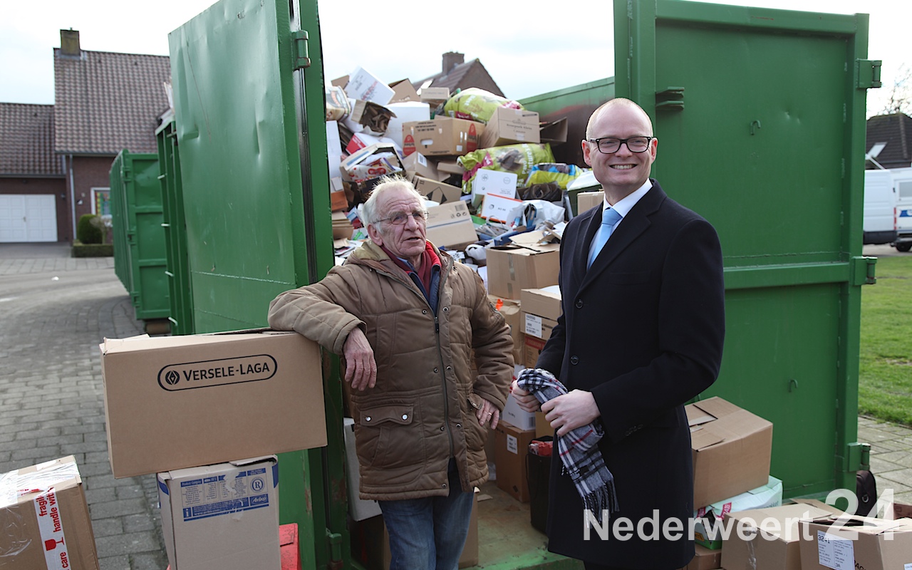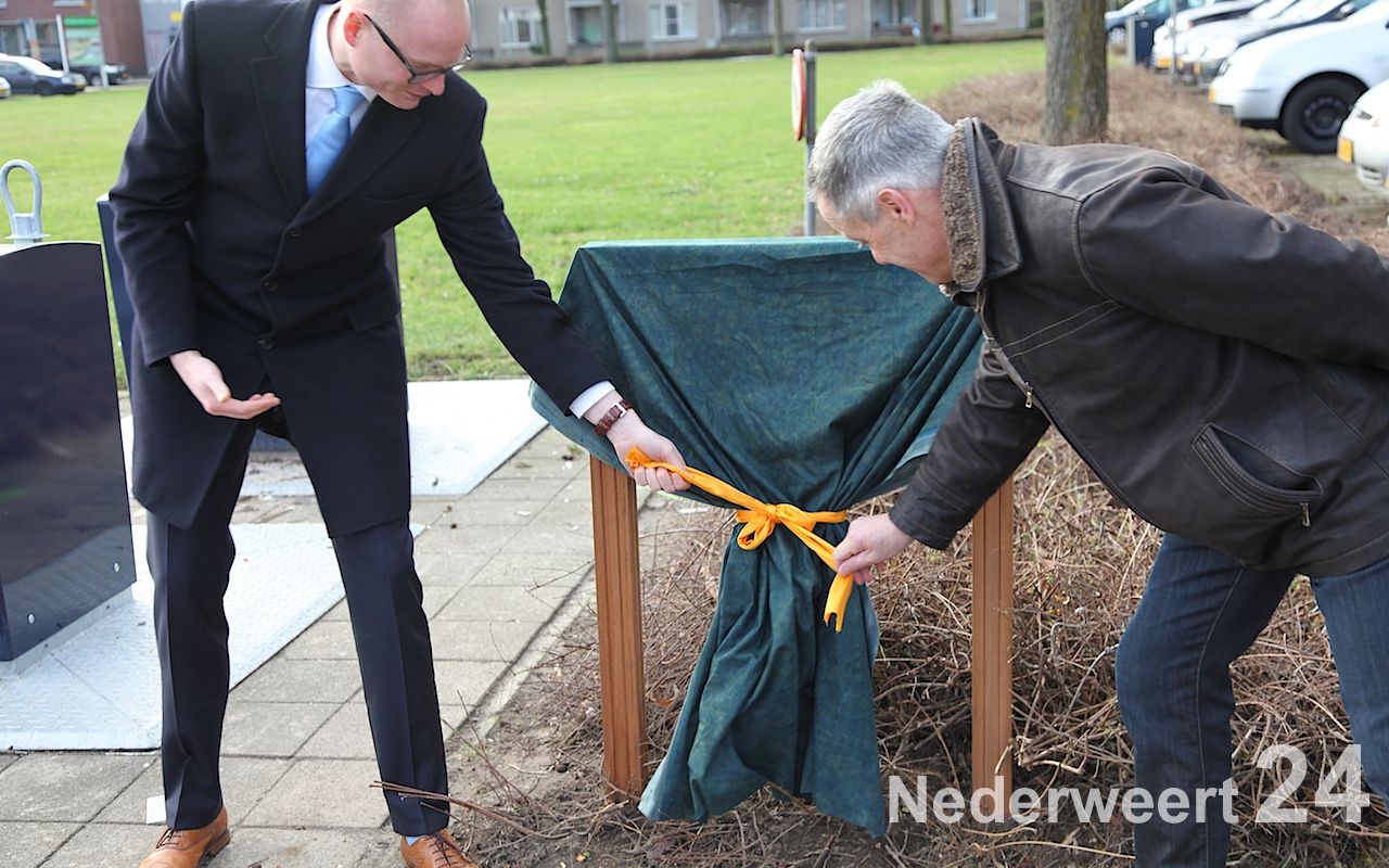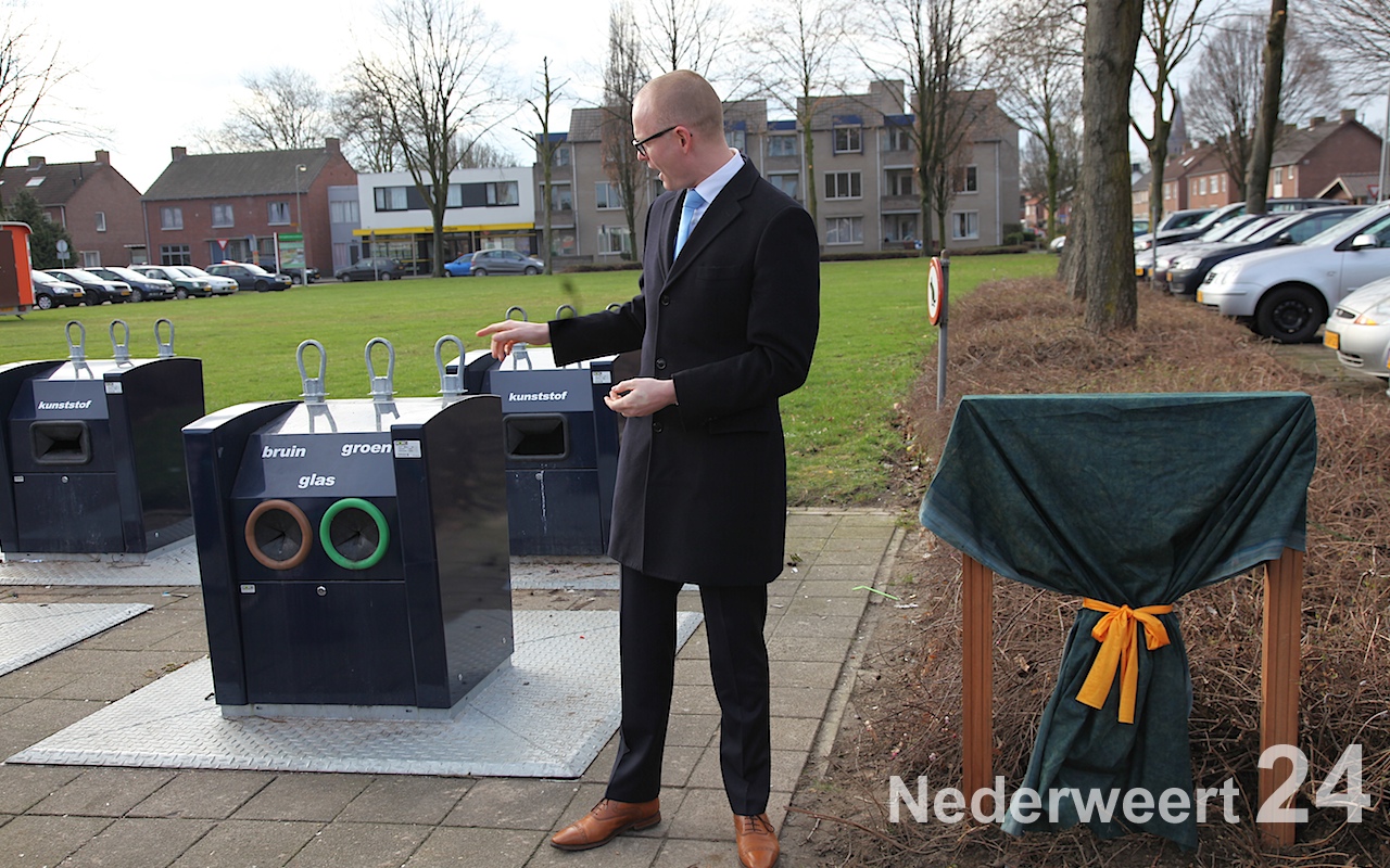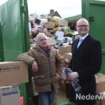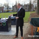 Na de onthulling van het bord gaf de wethouder nog een extra compliment aan Sjaak Kessels voor al zijn werkzaamheden voor de buurt. Al sinds jaar en dag onderhoudt Sjaak de tuin van de basisschool en zorgt hij ervoor dat het op en rondom het plein altijd netjes en opgeruimd is. En ja, vandaag is het oud papier dag, dus was Sjaak iedereen weer behulpzaam bij het stapelen van oud papier in de container.