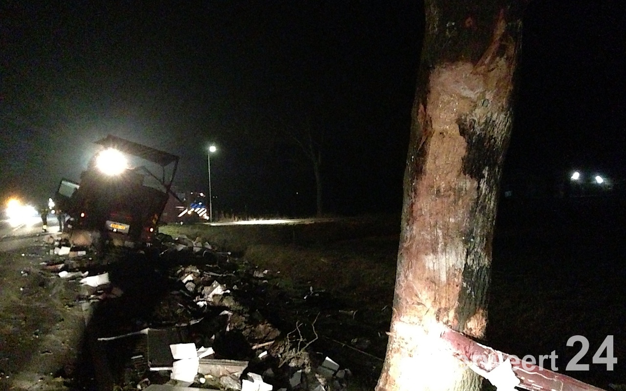 Vannacht heeft een vrachtwagen op de Venloseweg een boom geschampt. Komende vanuit Meijel richting Nederweert is de chauffeur naast de weg geraakt en daarbij een boom geraakt.