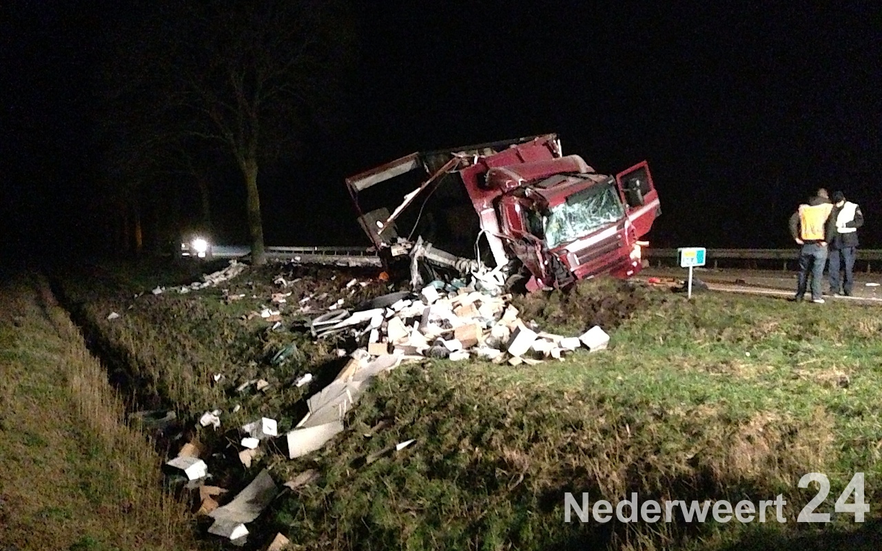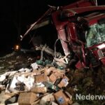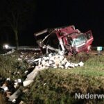 De vrachtwagen was van voor tot achter volledig open gescheurd waarbij de volledige lading uit de vrachtauto geschoven is. De politie doet onderzoek naar de toedracht van het ongeval. De weg zal tijdelijk afgesloten zijn door de werkzaamheden van de berger.