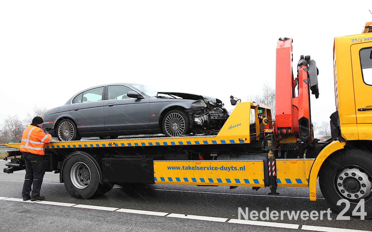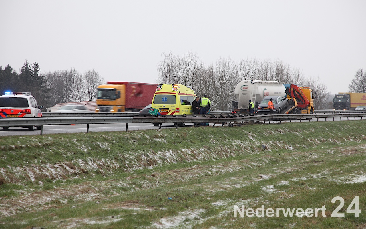 Komend vanuit de richting Maastricht was een stuk voor de afrit van Nederweert een auto van de weg geraakt en in de vangrail terecht gekomen. De ambulance was snel ter plaatse maar de chauffeur bleek ongedeerd. Er was wel flinke schade aan het voertuig.