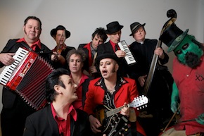 Een illuster zwart/rood gezelschap van 10 personen, dat zo uit de krochten van Londen lijkt komen, komt Nederweert onveilig maken en maakt er een waar circus van. Met twee drummers (waarvan er een groen is!), bespelen ze gitaren, banjo, trompet, accordeon, tuba, tenor sax, klarinet en wat er nog meer voorhanden is.