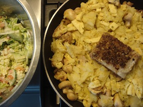 | De gesneden spitskool en de geschilde aardappelen net onder water zetten en gaar koken. De vis schoon spoelen en in de paneermeel leggen. Hierna rustig in de olijf- of walnootolie bakken. De eieren samen met de koffiemelk, peper en Keltisch zeezout mengen en hiervan rustig een omelet bakken. Champignons met de gesnipperde ui bakken. Giet het water uit de pan en stamp de spitskool met de aardappels, voeg er nootmuskaat aan toe. Vervolgens meng je dit met de champignons en ui. De omelet snijd je in kleine reepjes en voeg deze toe aan het geheel. Leg vervolgens de vis hierboven op. Dit geheel is ook lekker met een verse salade. |