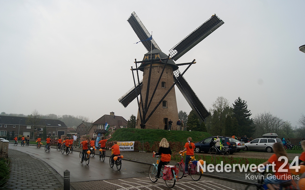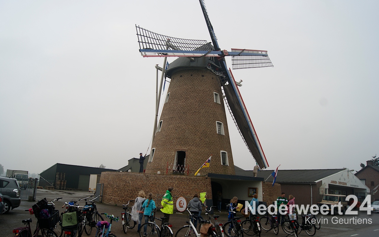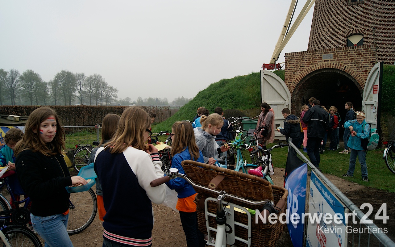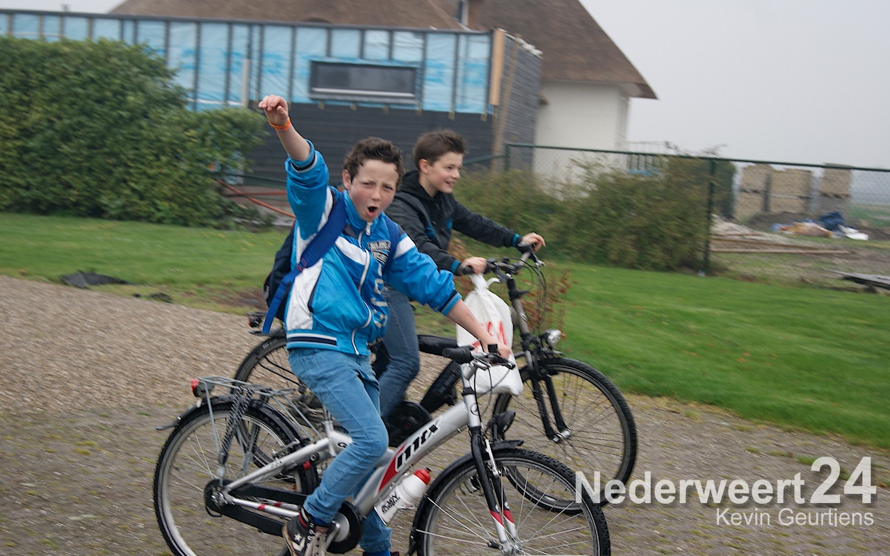 Ruim 440 leerlingen van de groepen 7 en 8 trotseerden het regenachtige weer door een tocht van 15 kilometer langs de drie gemeentelijk molens en de waterkrachtcentrale in Nederweert te fietsen. Het doel was zoveel mogelijk geld bij elkaar te fietsen voor de actie Alpe d’Huzes.