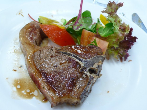 | Verhit olijfolie en boter in een koekenpan en bak hierin het vlees op hoog vuur aan beide kanten aan. Als beide kanten goed aangebakken zijn, het vuur laag zetten en de T-bones 10 minuten rechtop op hun vetlaagje bakken. Neem ze uit de pan en pak ze in met aluminiumfolie.