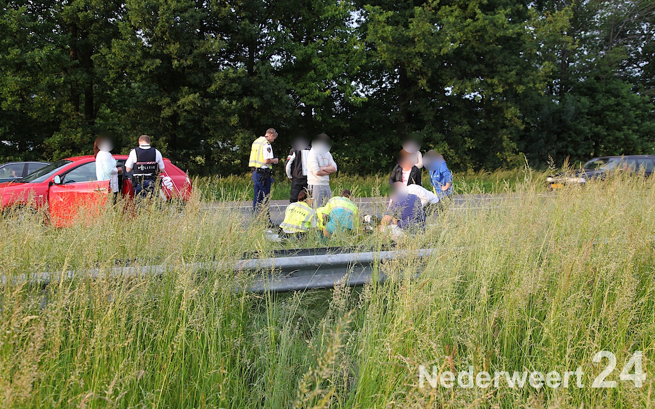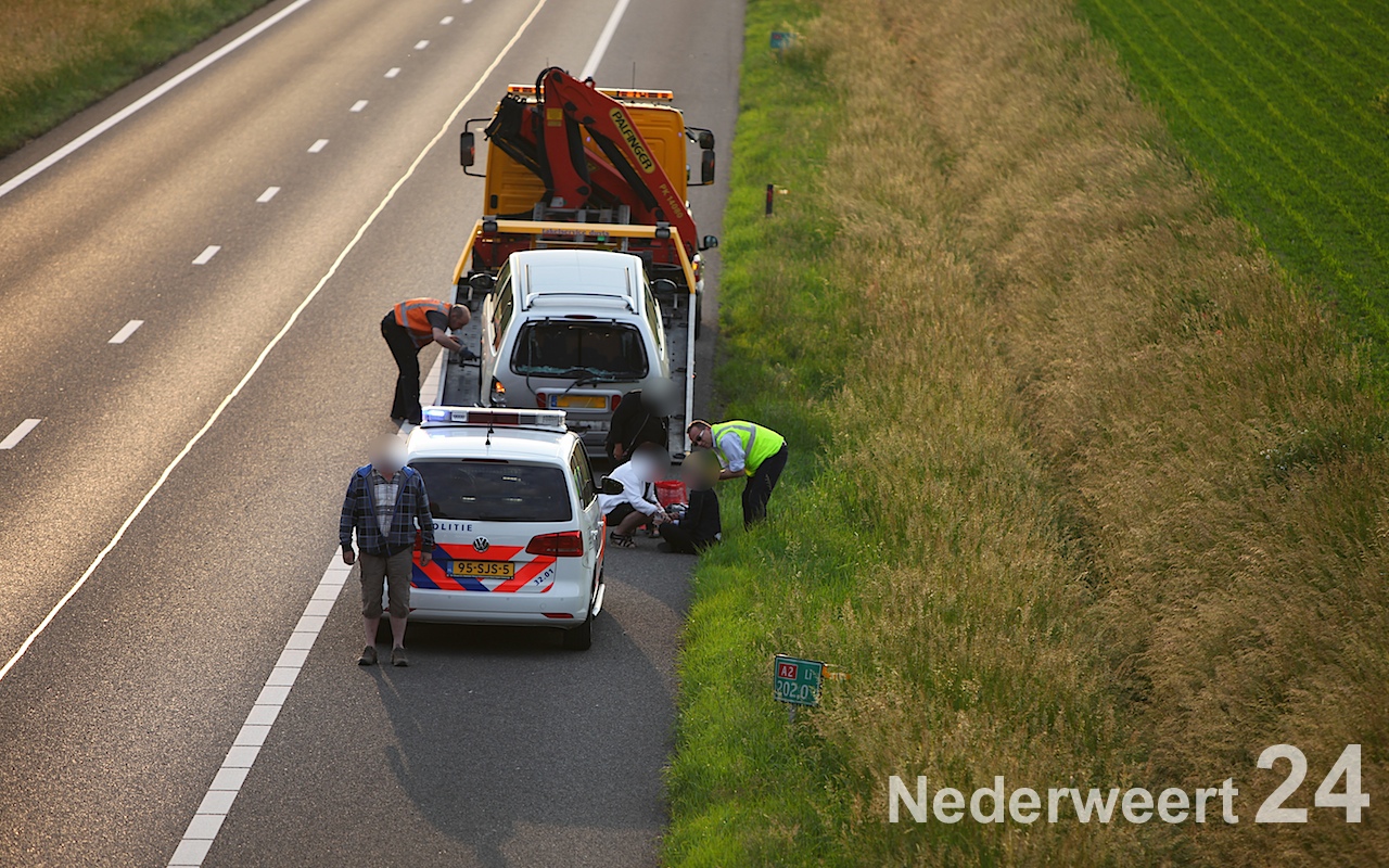 De motorrijder kwam vanuit Maastricht richting Eindhoven en is door nog onbekende oorzaak onderuit gegaan. De motor van de motorrijder is over de vangrail gevlogen en aan de andere kant van de A2 richting Maastricht terecht gekomen. De motorrijder zelf is doorgeschoven en in de berm tot stilstand gekomen. De ambulanceverpleegkundigen waren snel ter plaatse en hebben de motorrijder gestabiliseerd en meegenomen naar het ziekenhuis. Even verderop stond een auto waarvan de bestuurster achter het voertuig op de grond zat. Ze werd in eerste instantie door de politie gestabiliseerd waarna de verpleegkundigen het hebben overgenomen. De bestuurster is meegenomen naar het ziekenhuis. De auto was aan de achterkant flink beschadigd. Het is niet duidelijk of deze auto bij het ongeval van de motorrijder betrokken was.