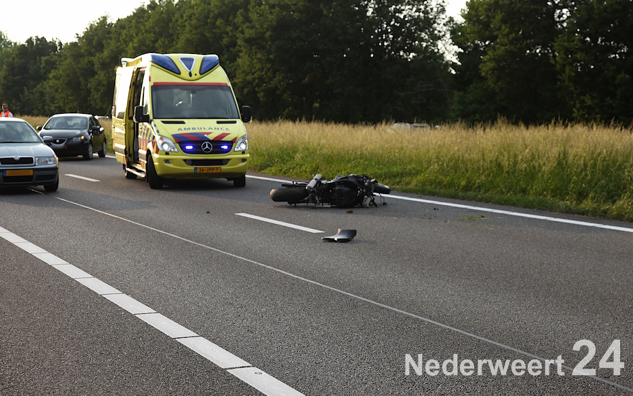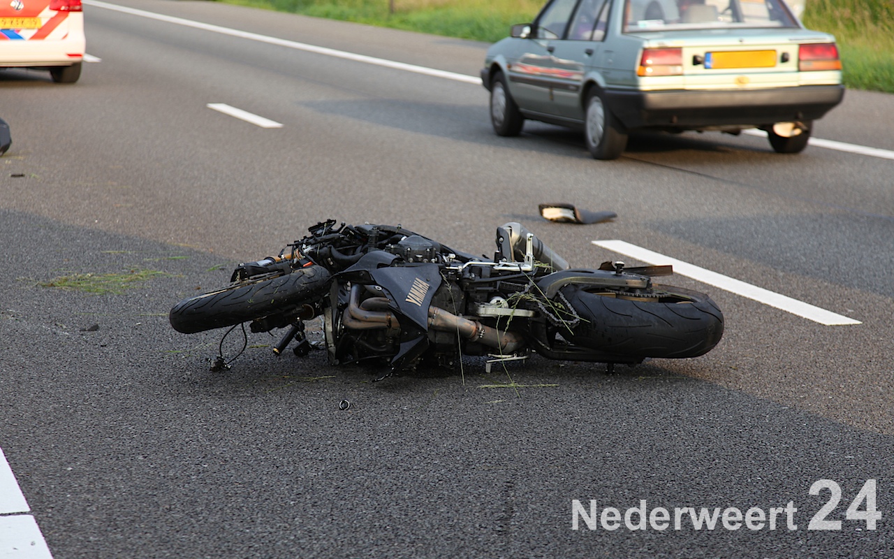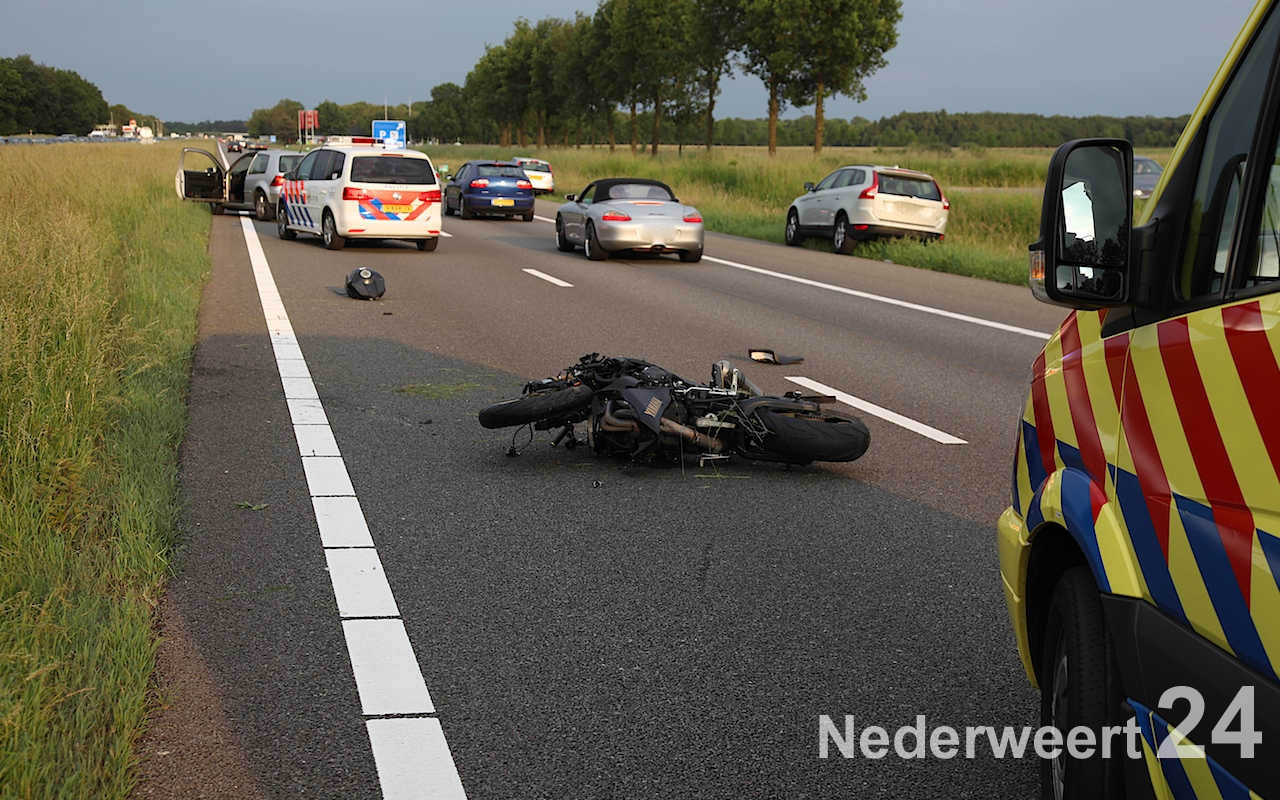 Een motorrijder is zondagavond rond de klok van acht uur hard onderuitgegaan op de A2 ter hoogte van het AC restaurant bij Nederweert.