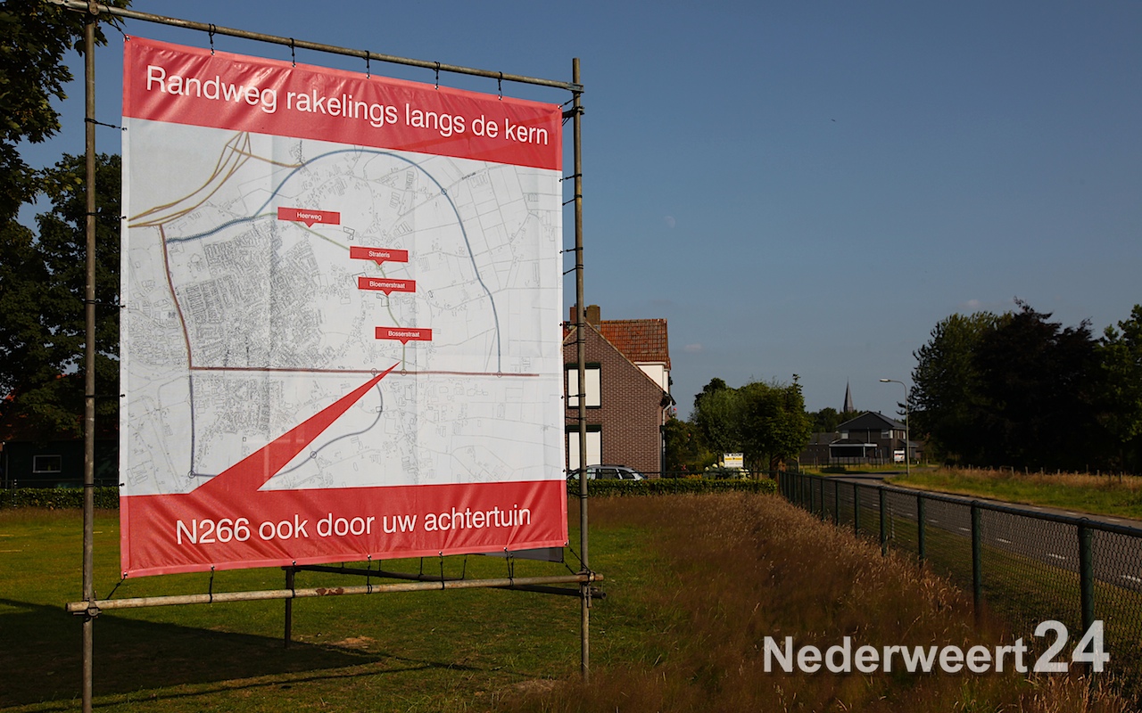 De woordvoerders van een zeer grote groep verontruste omwonenden in het gebied Kerneelhoven-Strateris-Heerweg-Peelsteeg-Klompensteeg-Bosserstraat-Hoebenstraat-Hoebenakker-Bloemerstraat-Gerristraat-Kleine Steeg-Karissteeg-Herstraat-Hardsteeg-Lage Kuilen en Hovensteeg hebben vandaag spandoeken geplaatst tegen een mogelijke variant van de N266 (Randweg N266 Nederweert) nabij de westelijke kern.