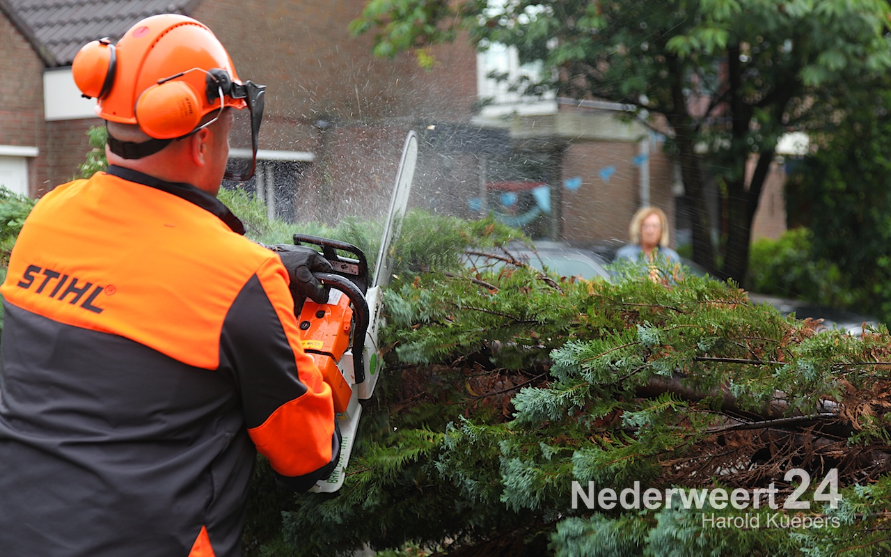 Door hevige regenval en de harde wind van zaterdagmorgen heeft een conifeer  de geest gegeven en is midden over de straat gevallen. Hierdoor was een gedeelte van het woonerf afgesloten. De brandweer heeft de boom in stukken gezaagd zodat de bewoners weer vrije toegang hebben.