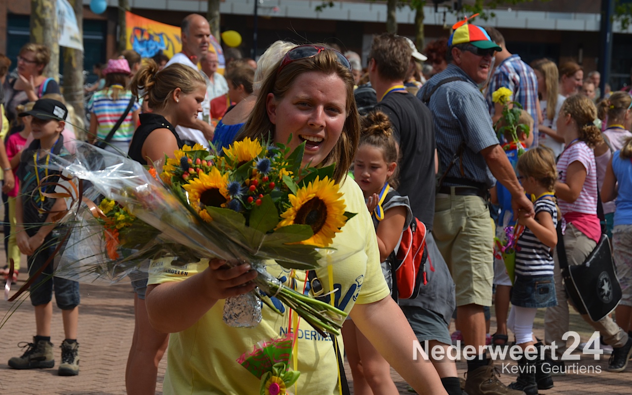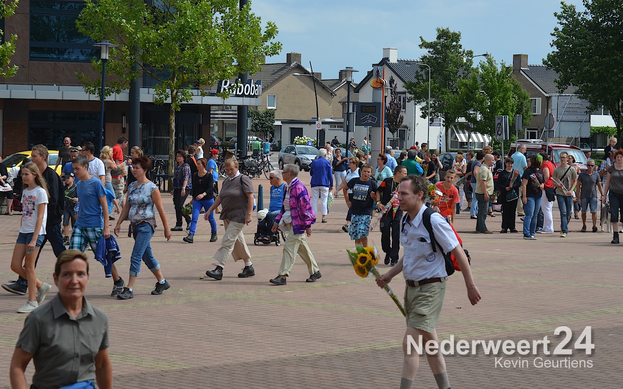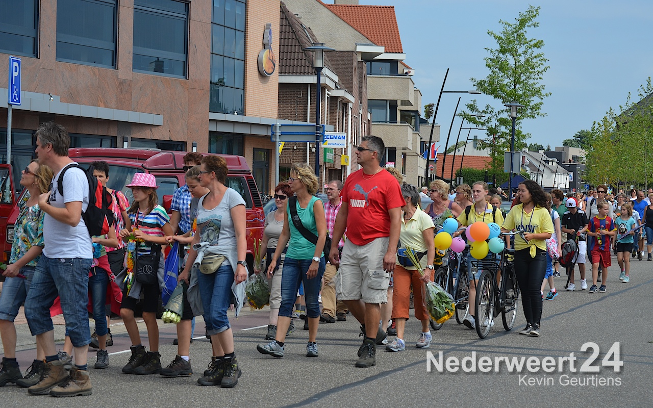 Zaterdagmiddag zijn ruim 700 wandelaars met bloemen en muziek onthaald op het Raadhuisplein in Nederweert.