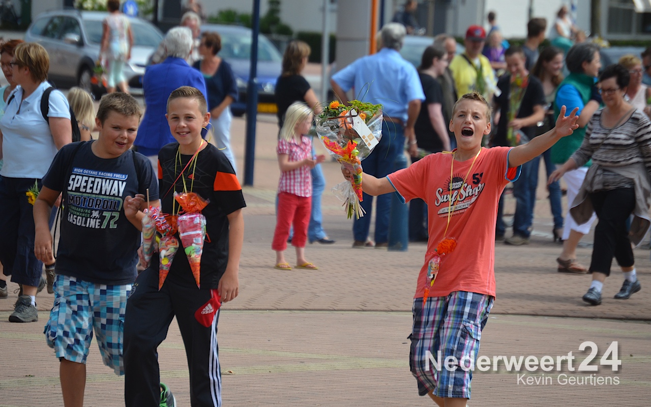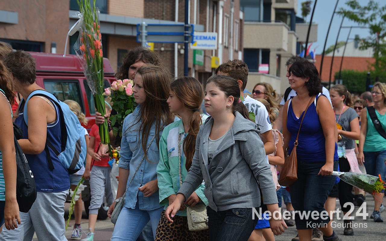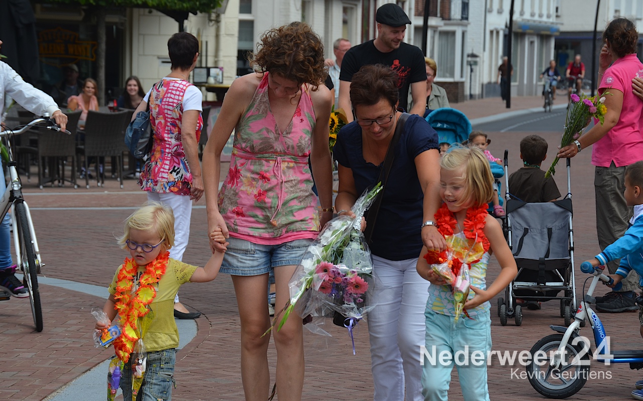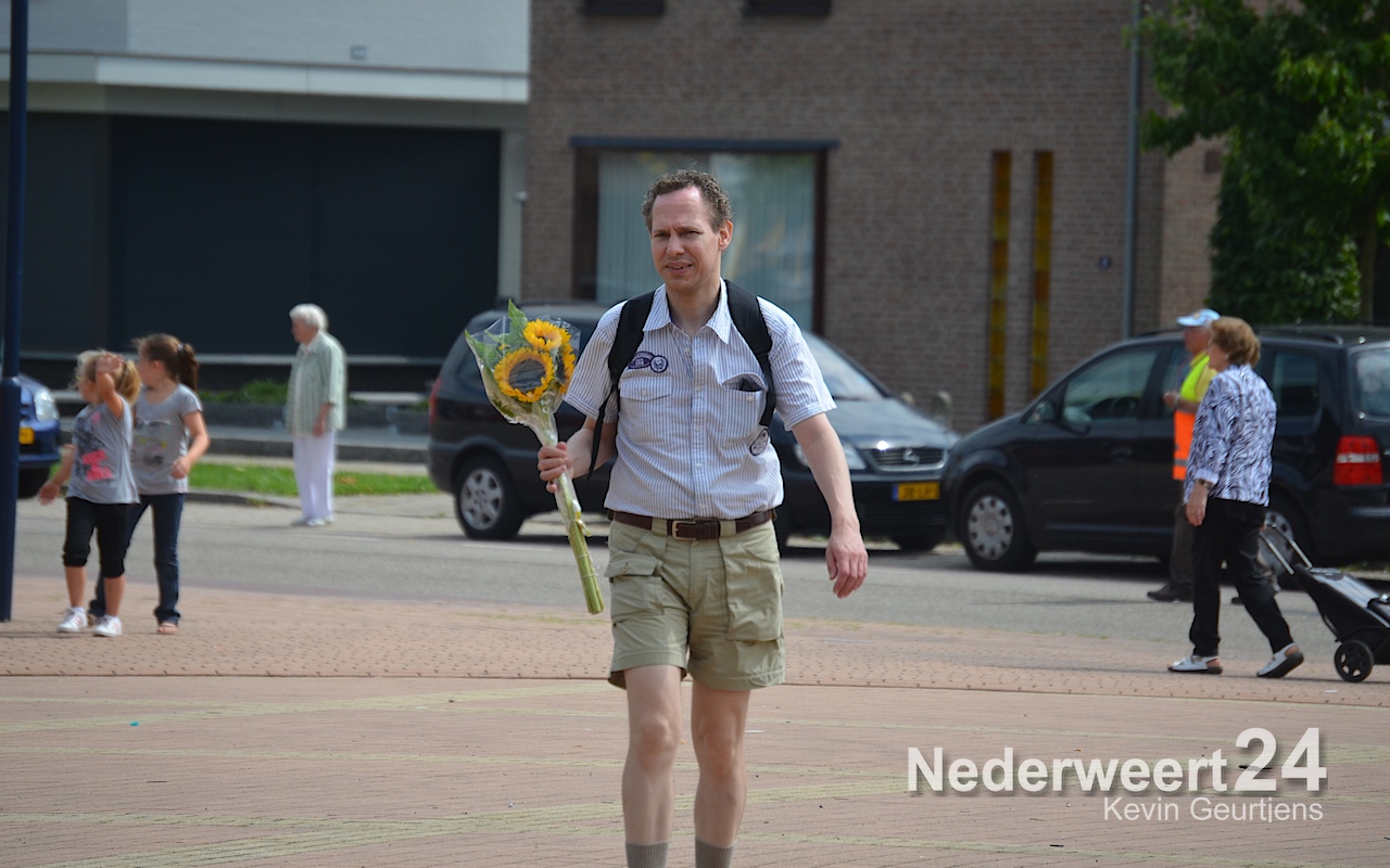 Zaterdagmiddag zijn ruim 700 wandelaars met bloemen en muziek onthaald op het Raadhuisplein in Nederweert.