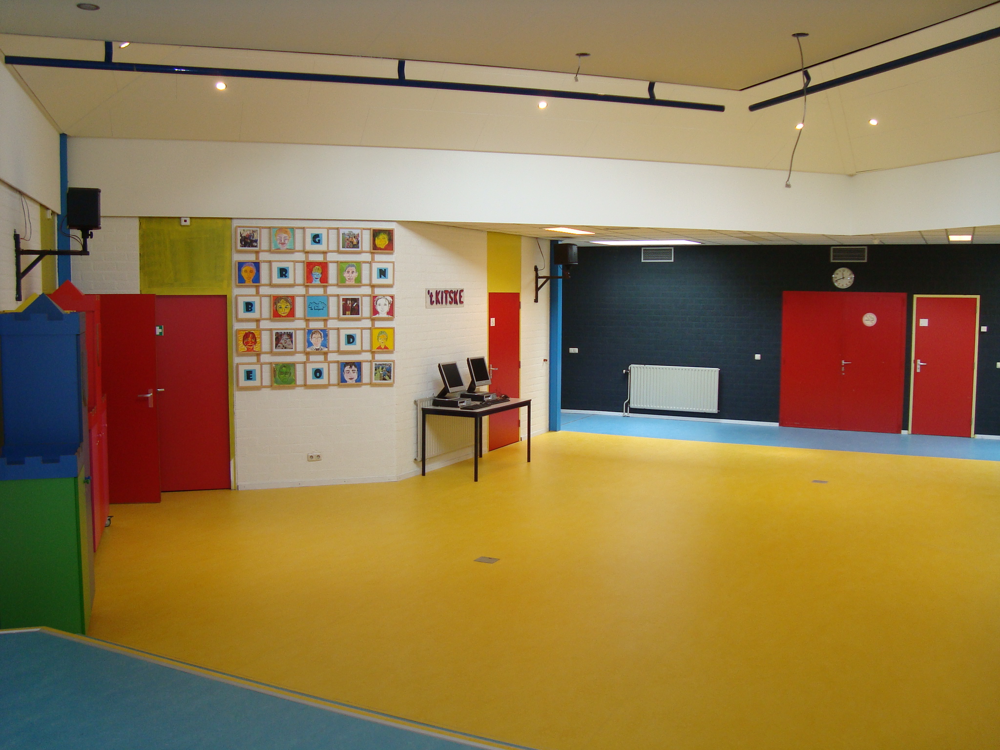 Tijdens de zomervakantie heeft de school namelijk een grote metamorfose ondergaan. Het centrale gedeelte van de school, ’t Kiske’ (klokhuis), is in een nieuw jasje gestoken. De vloerbedekking is vervangen door linoleum, er zijn lichtkoepels op het dak geplaatst en muren en kozijnen hebben een nieuw likje verf gekregen. Ook buiten op de speelplaats stond de kinderen een grote verrassing te wachten. Zo is er een reuze twisterspel gekomen en zijn er verschillende hinkelbanen geschilderd. Op deze manier wordt de speeltijd nog uitdagender.