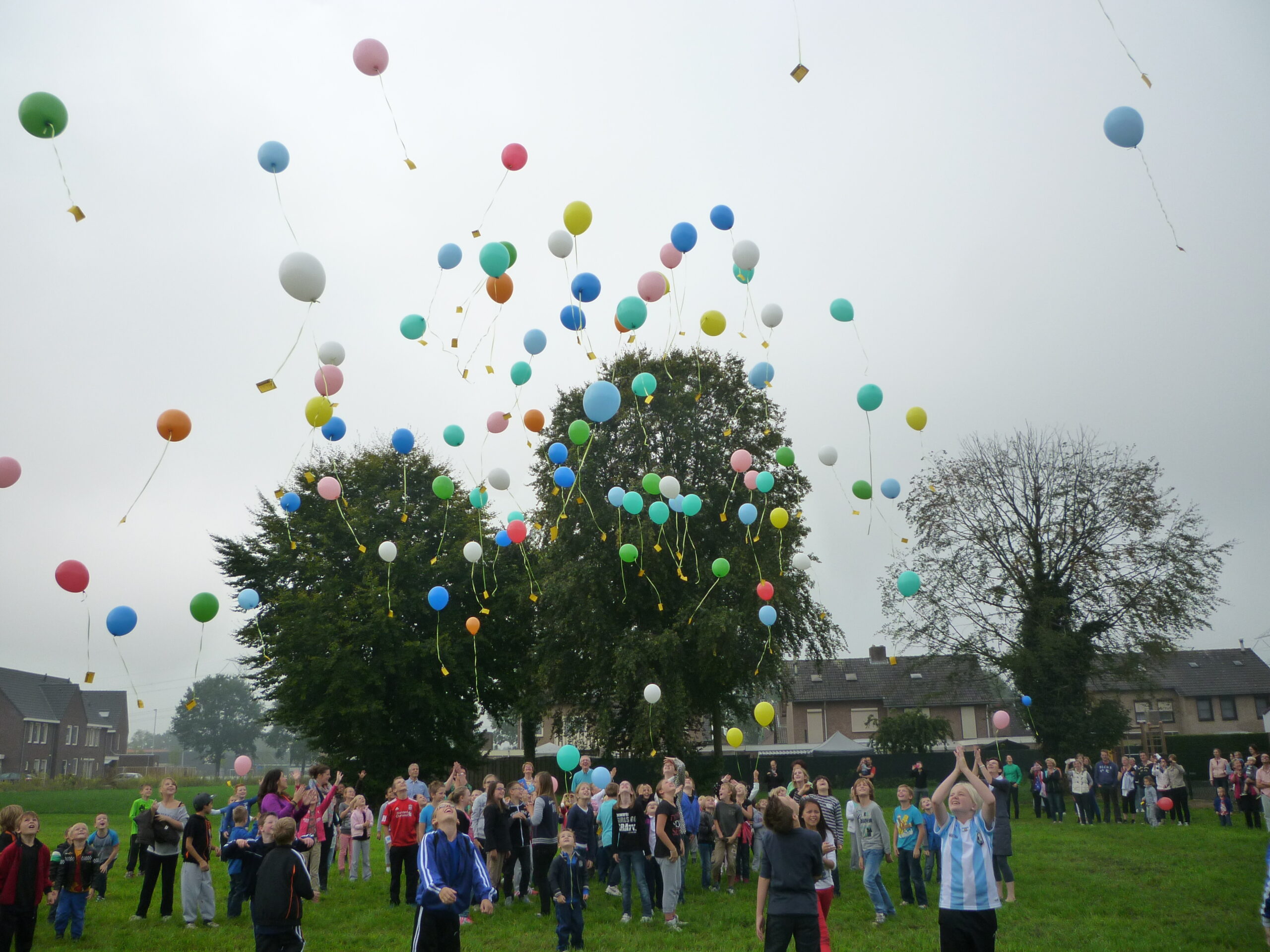 De dag werd onder groot publiek van ouders, grootouders, oud collega’s en andere geïnteresseerden afgesloten met een luchtig einde. Alle kinderen kregen een gekleurde ballon met een kaartje met hun naam erop en lieten deze allemaal tegelijk op. Nu is het nog maar de vraag wie deze wedstrijd gaat winnen… Op naar de volgende 25 jaar!