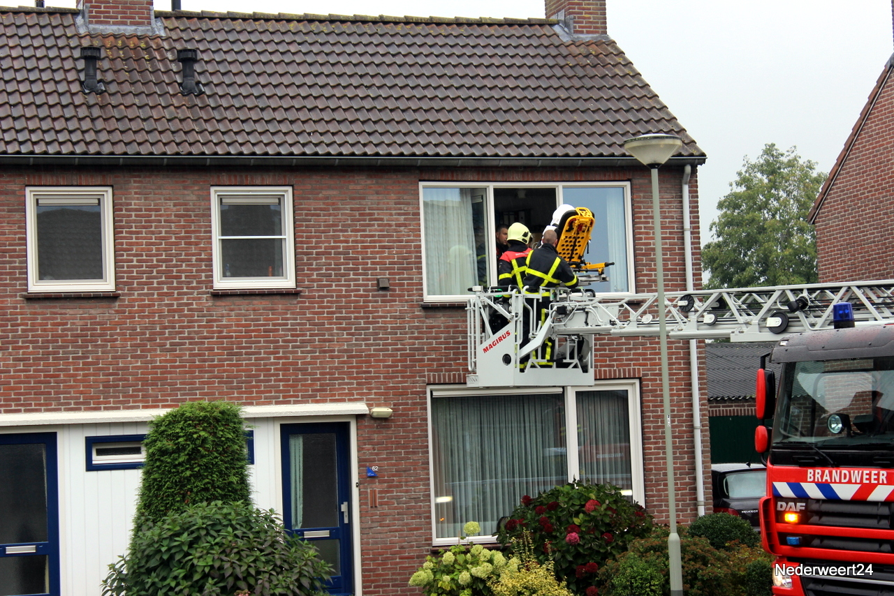 Brandweer assisteert ambulance-004Vrijdagmiddag rond half 2 werd een ambulance opgeroepen naar de Bernhardstraat in Budschop. Een bewoner was onwel en moest met spoed naar het ziekenhuis. Het ambulance personeel riep de hulp in van de brandweer om de patiënt door een raam op de bovenverdieping naar buiten te halen.