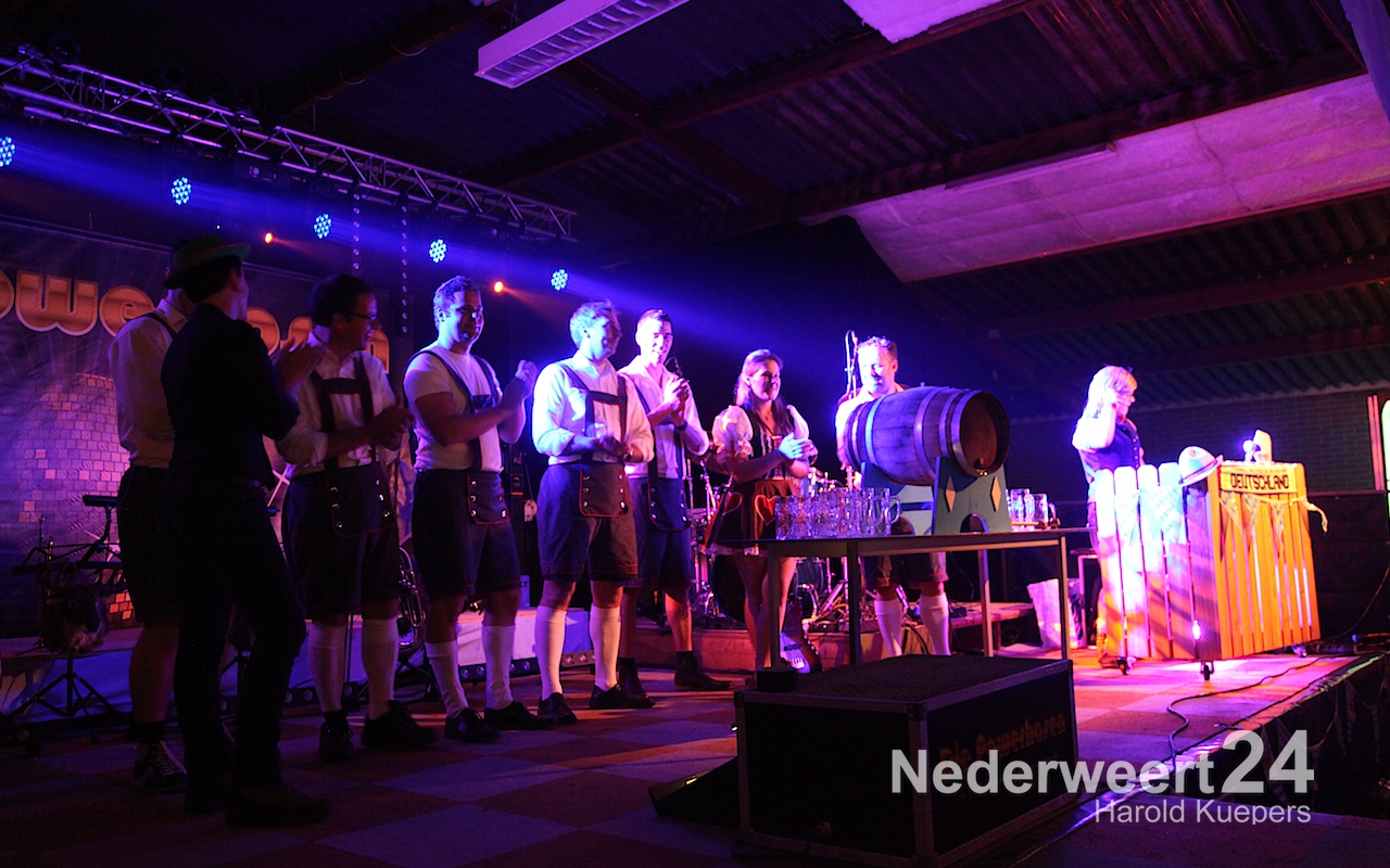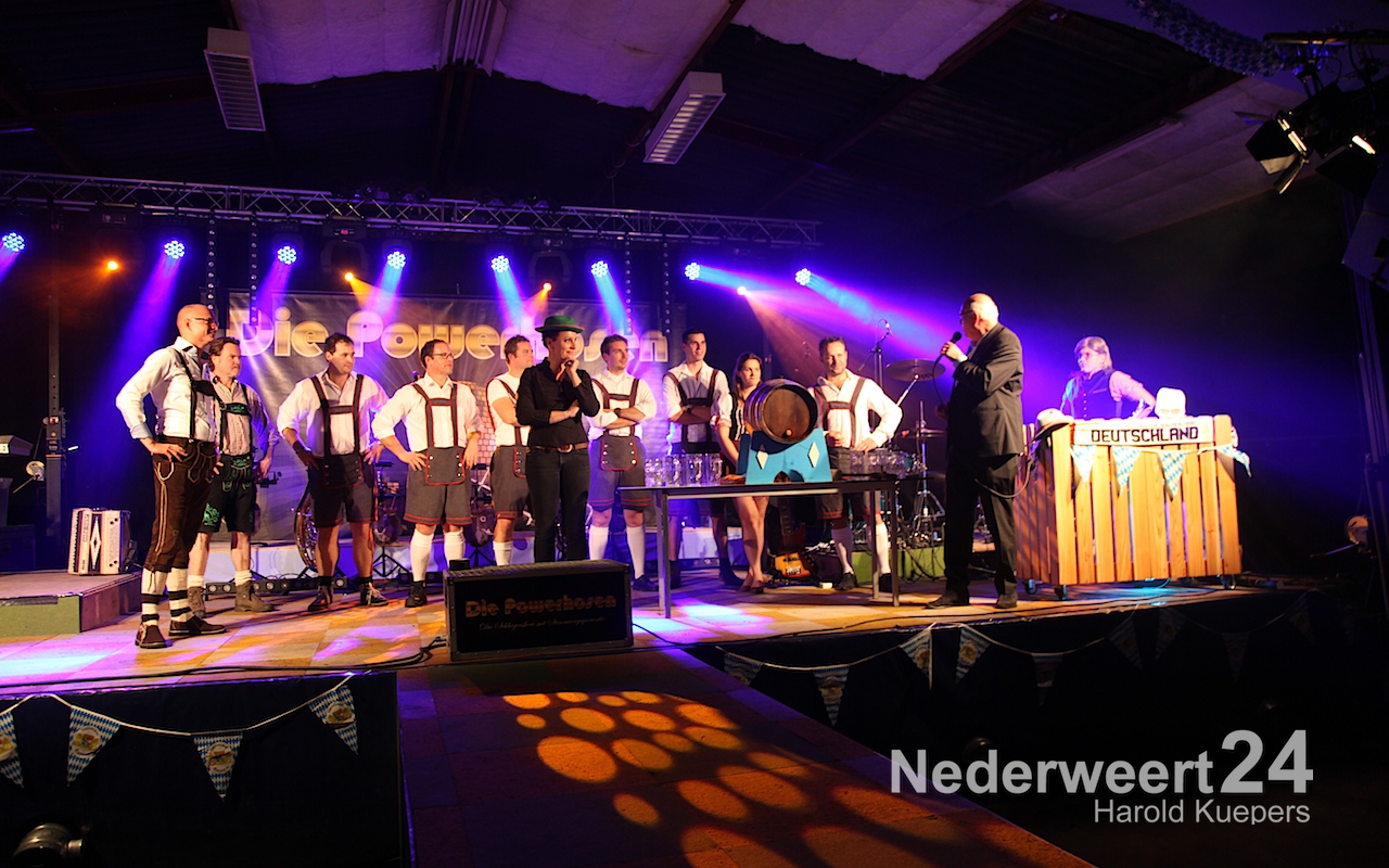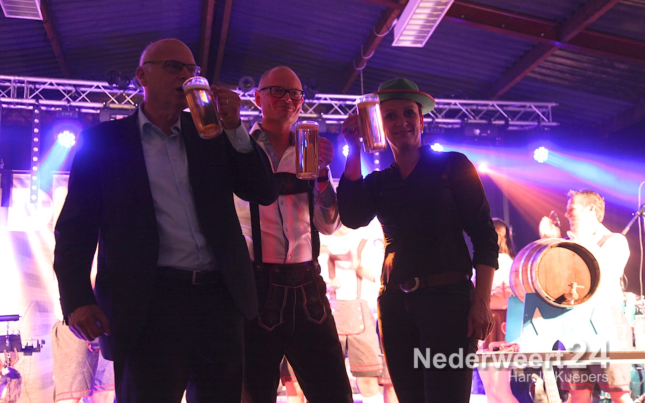 Wethouder Mackus had de eer om symbolisch het eerste biertje te tappen waarna Die Powerhosen uit Bielefeld de sfeer direct goed wist neer te zetten. Het zal nog lang onrustig zijn in Ospel maar morgenvroeg om 10:00 uur moet iedereen weer fit zijn voor het Brunchconcert. Vanaf 14.00 uur zal het ‘Festival der Blasmusik’. m.m.v. Fanfare Concordia Leveroy, Harmonie Pro Musica Nederweert-Eind, Harmonie Melodie der Peel Ospel beginnen te spelen.