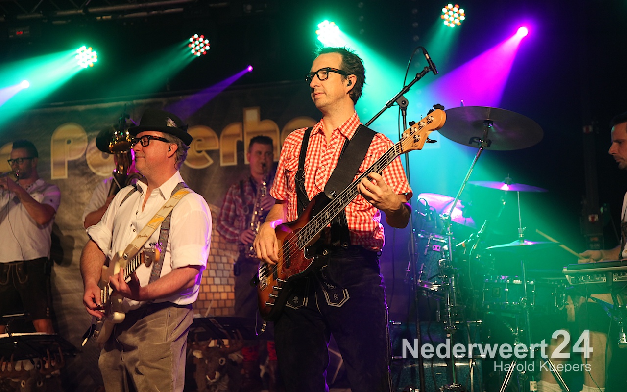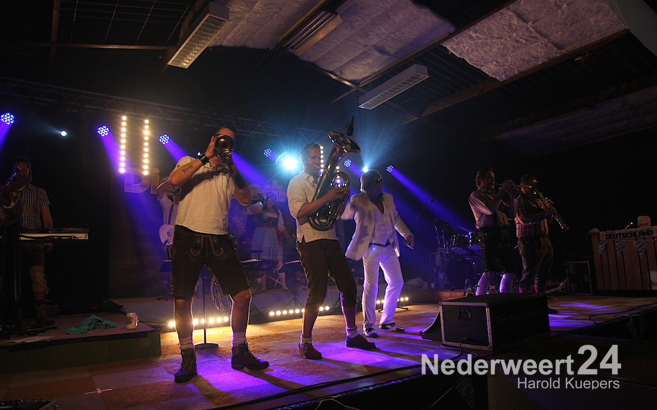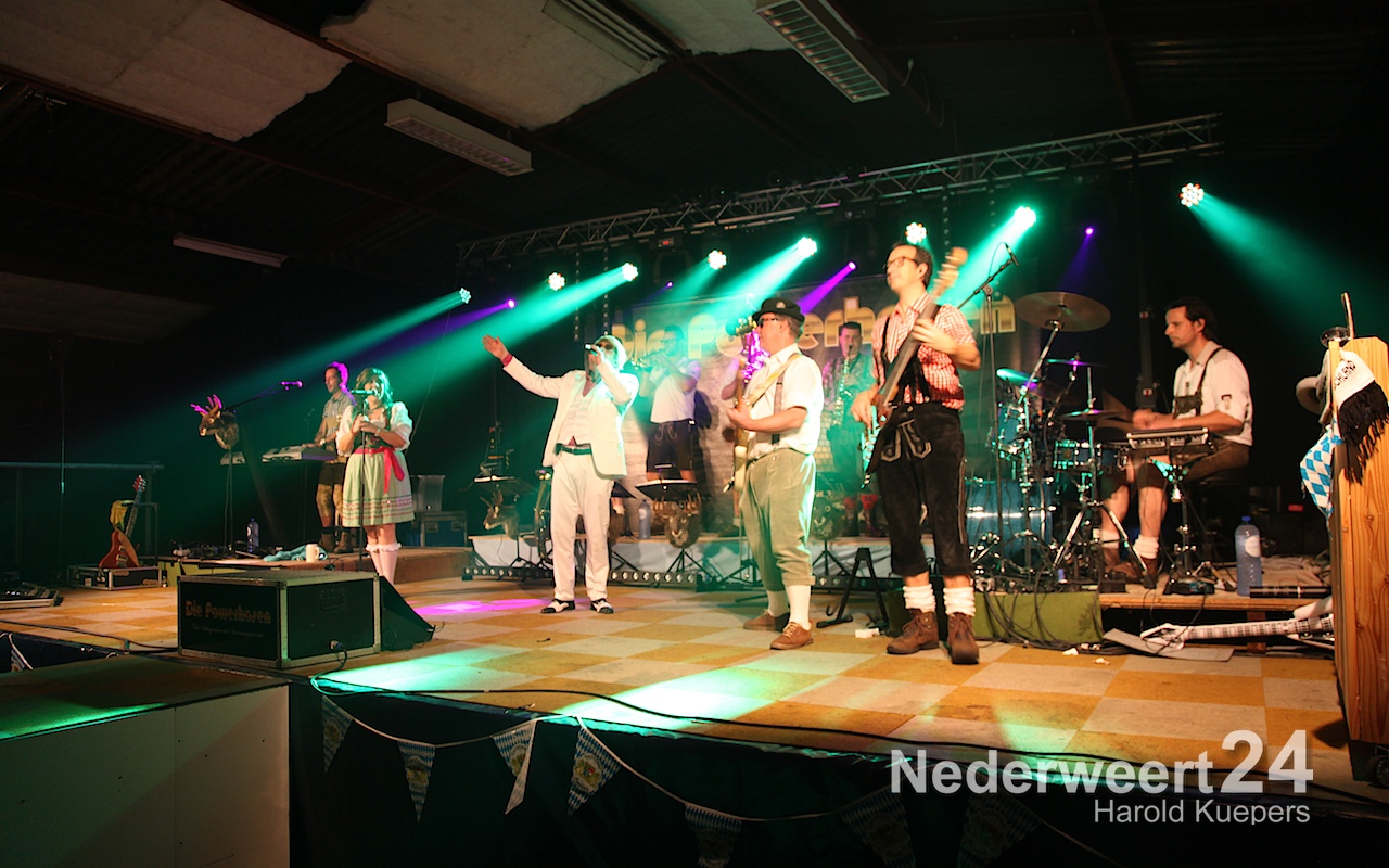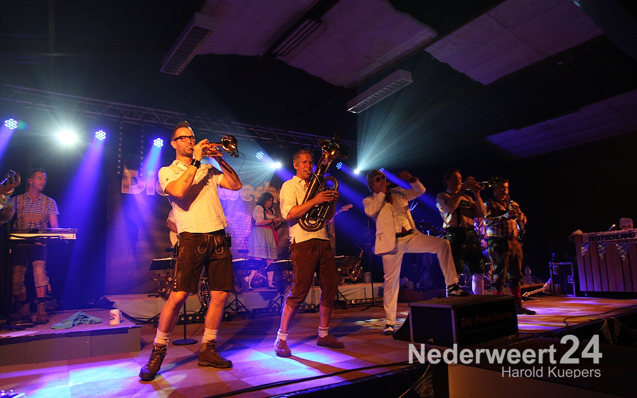 Wethouder Mackus had de eer om symbolisch het eerste biertje te tappen waarna Die Powerhosen uit Bielefeld de sfeer direct goed wist neer te zetten. Het zal nog lang onrustig zijn in Ospel maar morgenvroeg om 10:00 uur moet iedereen weer fit zijn voor het Brunchconcert. Vanaf 14.00 uur zal het ‘Festival der Blasmusik’. m.m.v. Fanfare Concordia Leveroy, Harmonie Pro Musica Nederweert-Eind, Harmonie Melodie der Peel Ospel beginnen te spelen.