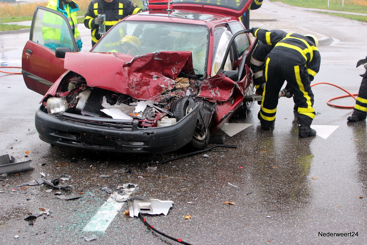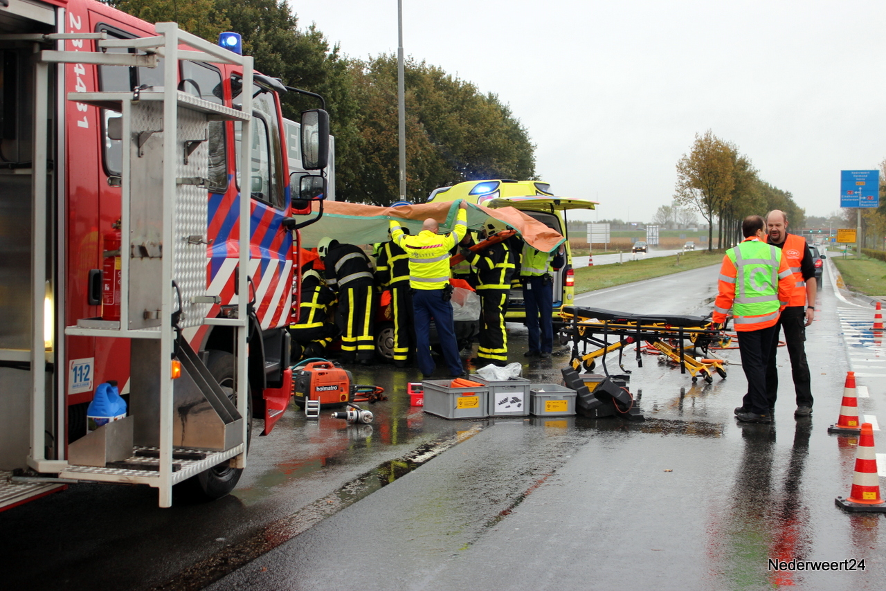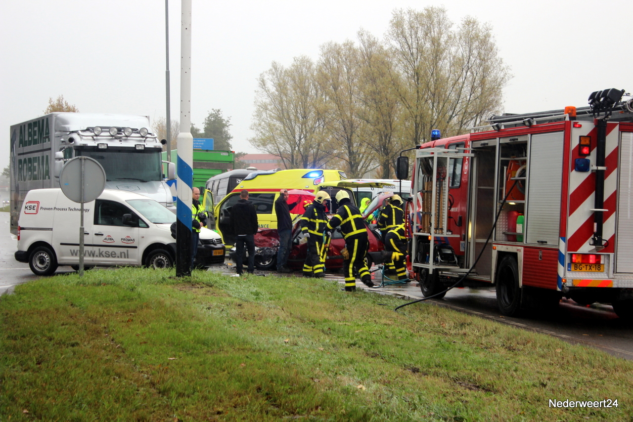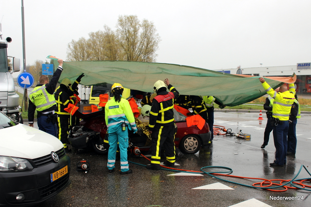 De personenauto zat dermate in elkaar dat de bestuurder met zijn benen klem in de auto zat. Rond 10.00 uur kon de bestuurder uit het voertuig worden gehaald en is toen per ambulance afgevoerd naar het ziekenhuis in Weert. De ringbaan richting Nederweert werd tijdelijk afgesloten en het verkeer moest over het industrieterrein. De juiste toedracht wordt nog onderzocht.