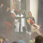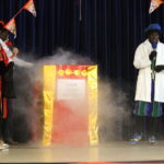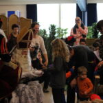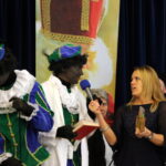 Na aankomst ging het hele gezelschap naar binnen en kregen de kinderen de gelegenheid om Sinterklaas een hand of een tekening te geven. Opeens werd de aandacht getrokken door een geluid uit de zaal. Een huilend geluid kwam van achter een gordijn. De politie ging kijken en trof daar de dief van de staf van Sinterklaas aan. Hij had van de staf allemaal muntjes gemaakt. Een heel slimme piet wist de oplossing. Met een goud smelt machine zou hij de muntjes smelten en er weer een staf van toveren. De machine begon te roken en na een tijdje kwam de staf van Sinterklaas weer tevoorschijn. Sinterklaas was blij dat de staf weer terecht was. Er werden nog liedjes gezongen en Sinterklaas vertrok weer om nog andere kinderen te bezoeken. Het worden drukke tijden voor Sinterklaas.