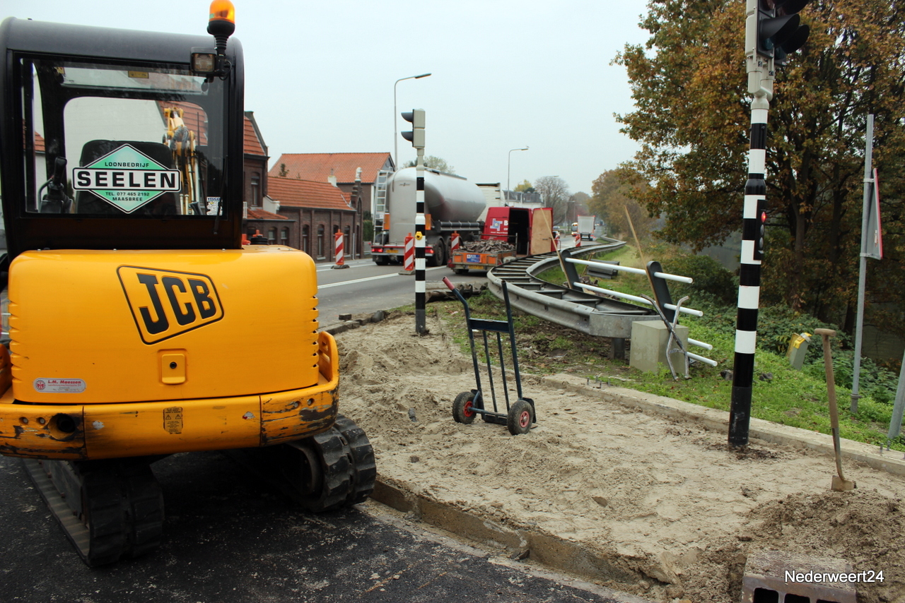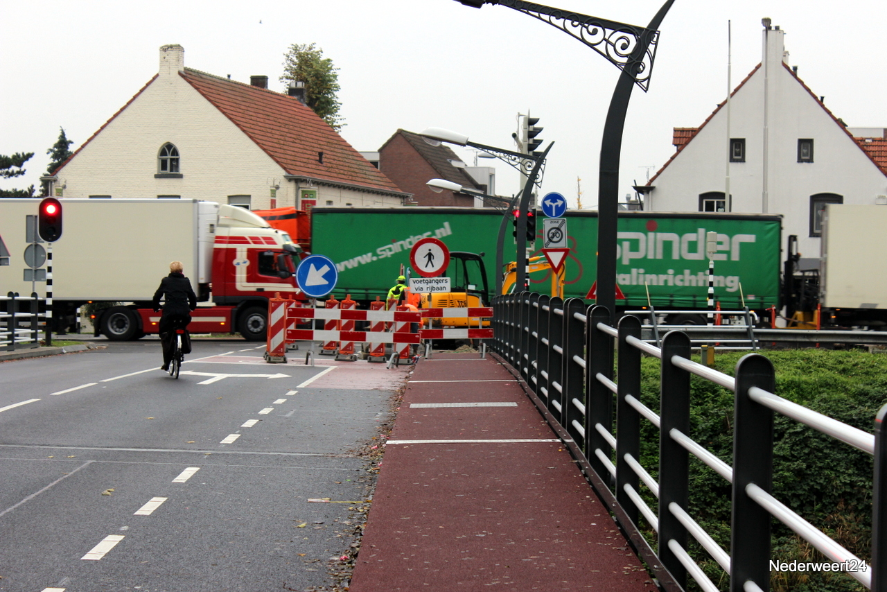 Maandagmorgen is aannemer Bloemen begonnen met het herstelwerk aan brug 15 in Nederweert. Meteen na de opening van de brug werd vastgesteld dat de bocht naar rechts voor de lijnbus te krap was. Na onderzoek werd besloten de bocht ruimer te maken zodat de bus straks wel van Budschop over de brug richting Zorgcentrum St. Joseph kan. De aannemer heeft vandaag de bestaande bestrating bij het stoplicht voor voetgangers open gebroken en de stoepbanden weggehaald. Hiervoor zijn een aantal verkeersmaatregelen ingesteld.