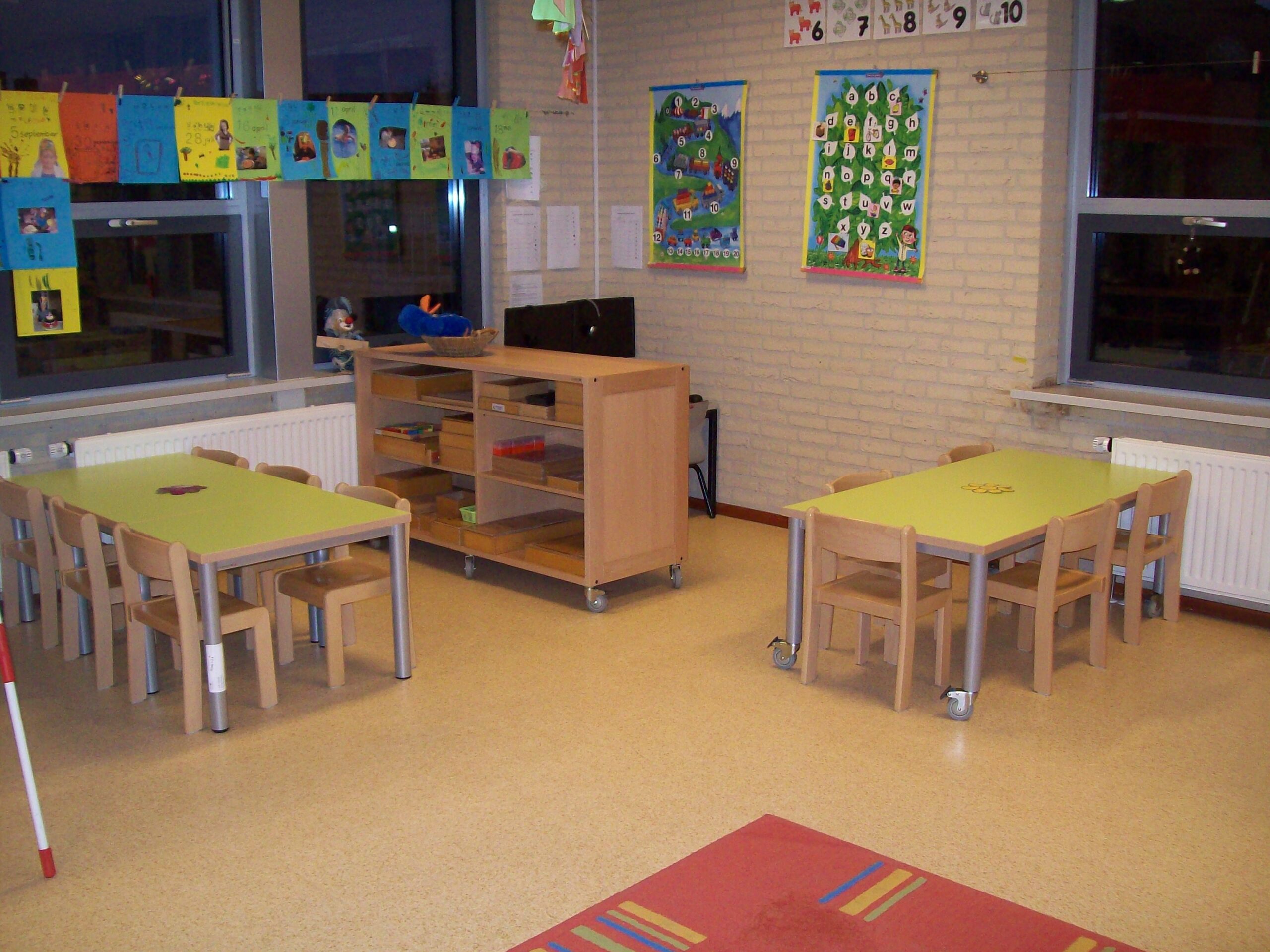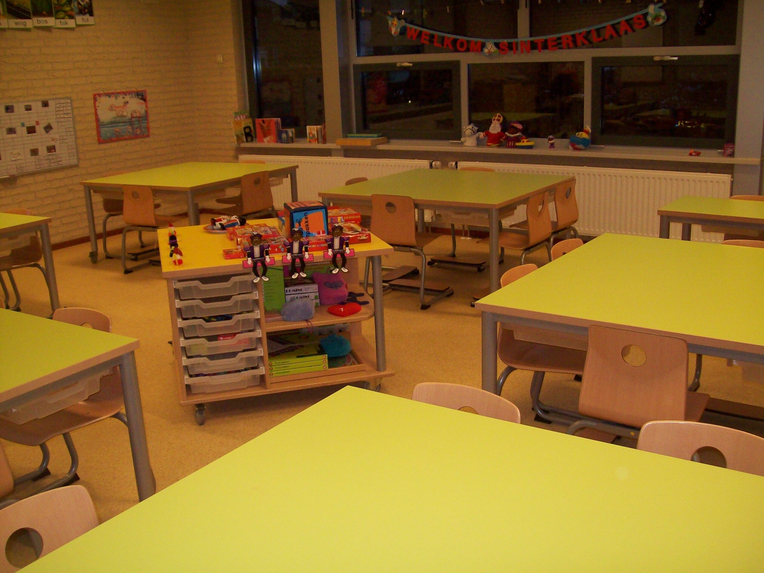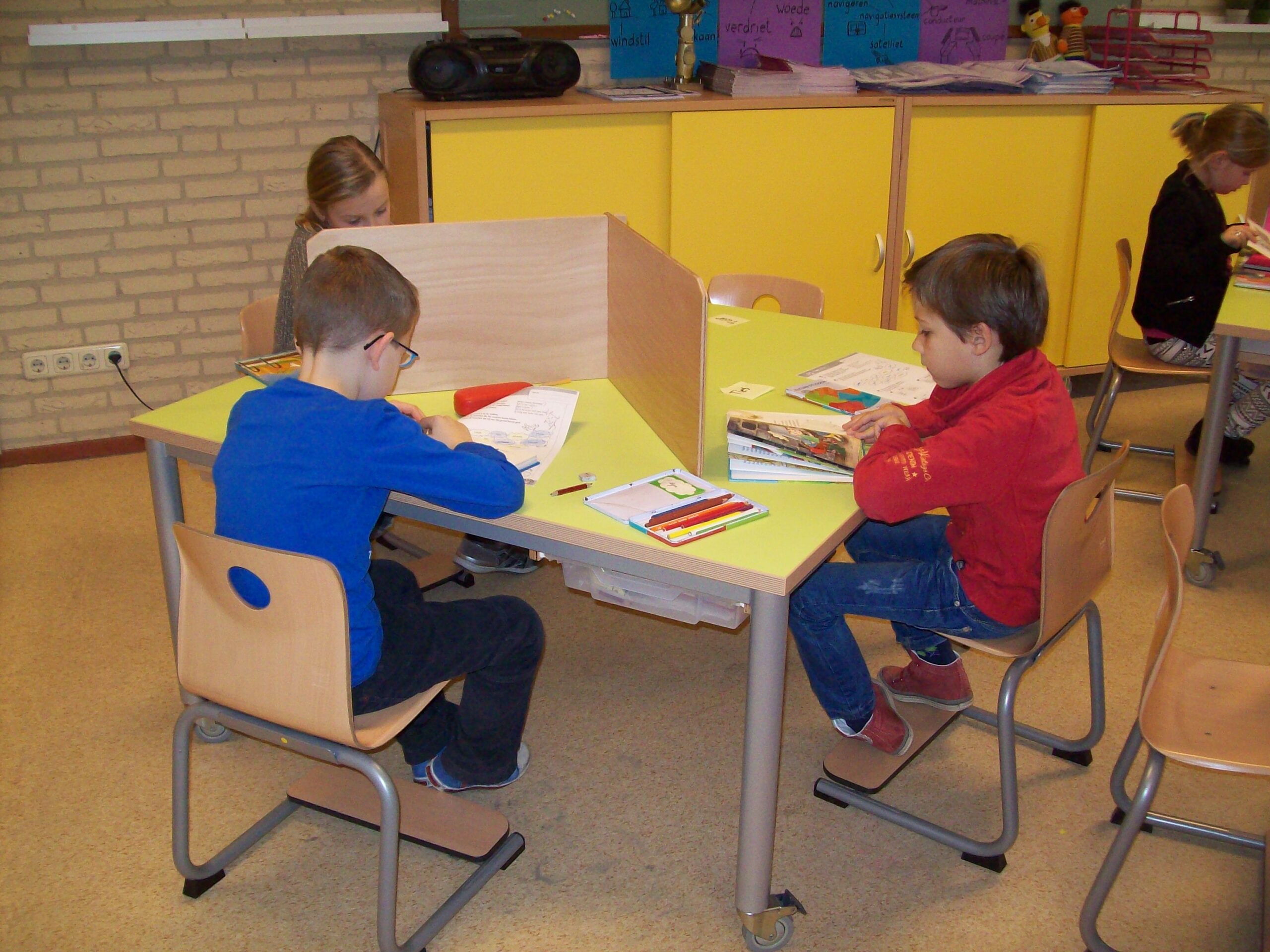 Het meubilair was ruim 30 jaar oud en ook aan vervanging toe. Vorige week kregen de groepen 1 t/m 4 nieuwe tafels, stoelen, kasten en bureaus. Ze hebben nu bijna allemaal groepstafels waar we met vier kinderen aan kunnen werken. In groep 3 en 4 hebben ze ook een expo-blok gekregen. Dit is een soort tafel-kast, waar ze spullen op exposeren! De tafels zijn groen en de kasten zijn geel. Dus we hebben hele frisse kleuren in de klassen!