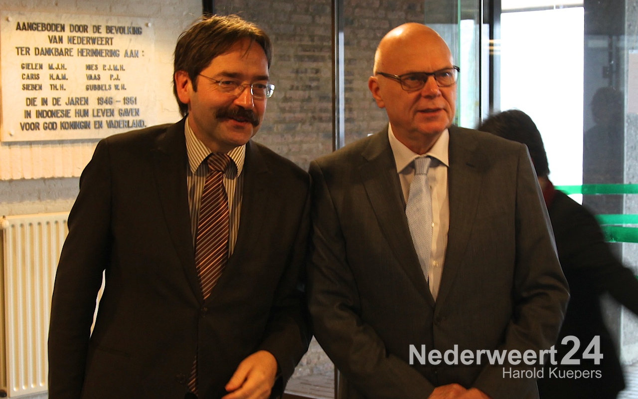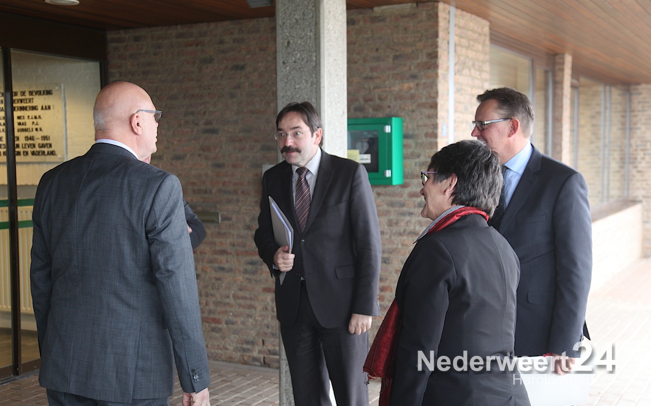 Woensdagmorgen bracht Gouverneur Th. Bovens een werkbezoek aan de gemeente Nederweert. Hij werd opgewacht en hartelijk ontvangen door Burgemeester Evers en zijn kabinetschef Bruijnaers bij de ingang van het gemeentehuis van Nederweert.
