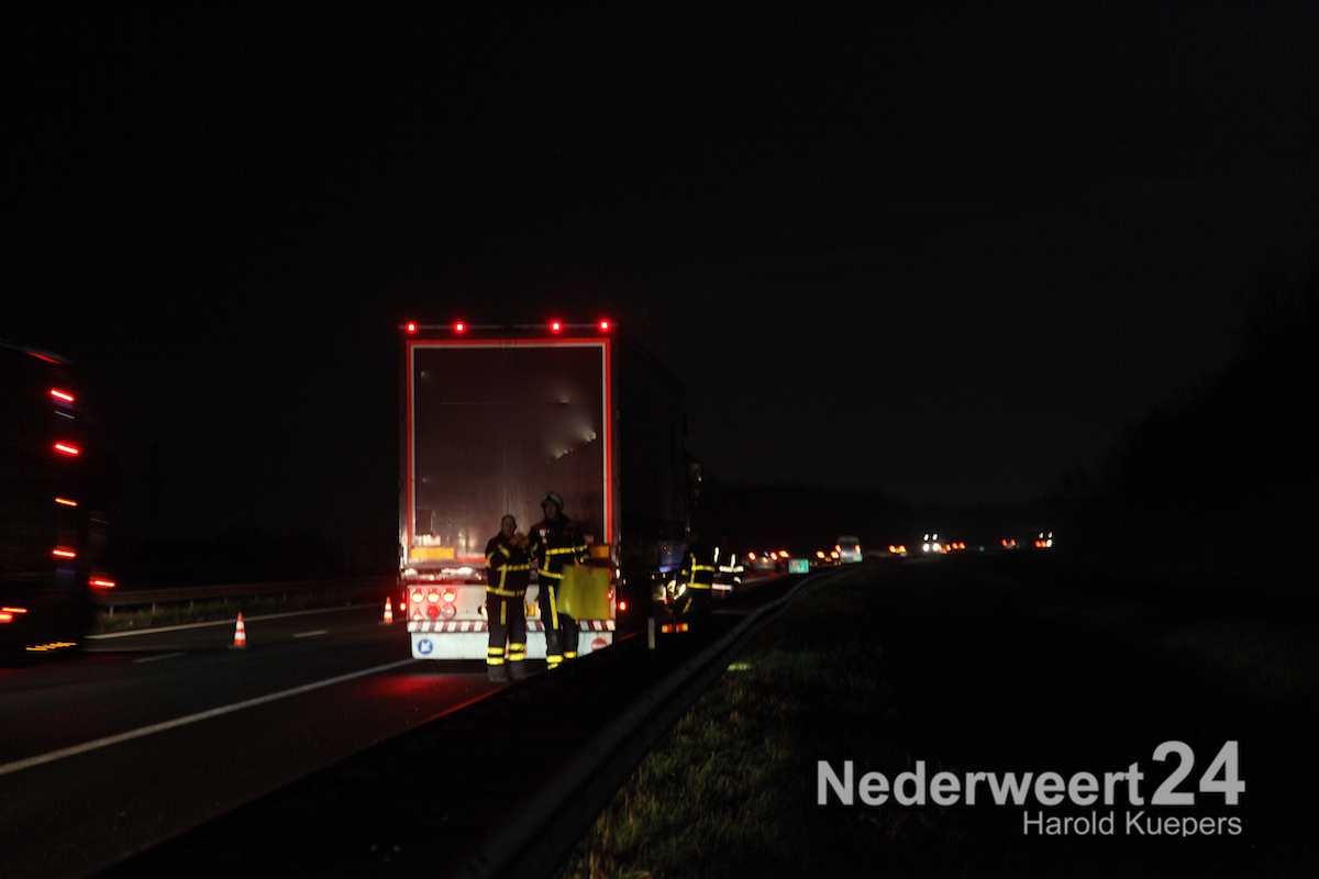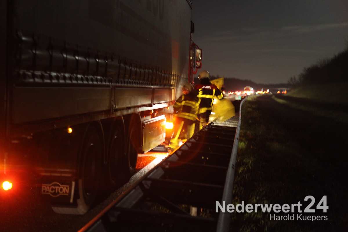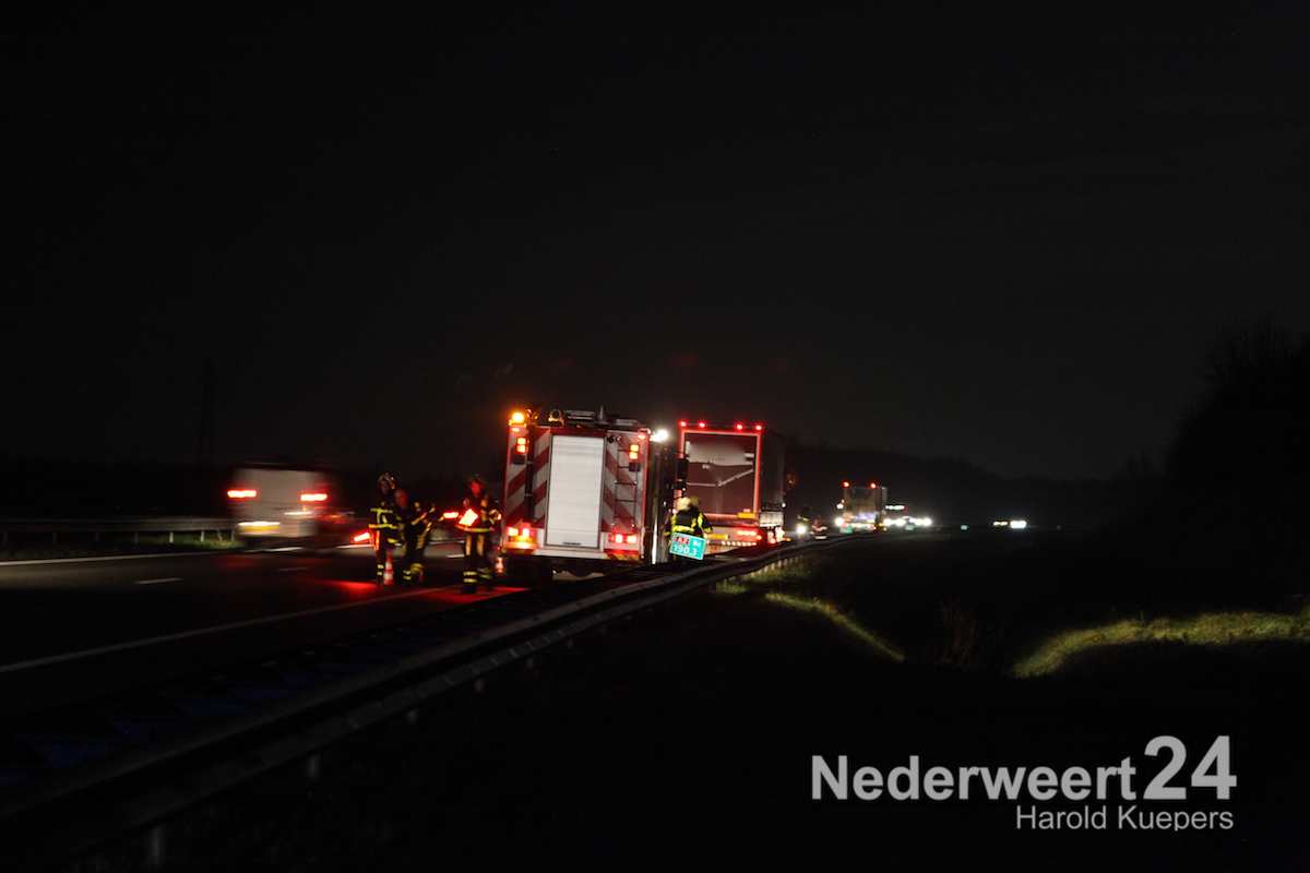 De brandweer van Weert werd gealarmeerd om hulp te verlenen aan de vrachtwagen die op de vluchtstrook stond. Met behulp van een “spilbag” werd de diesel uit de nog lekkende dieseltank opgevangen. Rijkswaterstaat werd gewaarschuwd om eventueel het wegdenk schoon te maken. Het verkeer vanuit Eindhoven ondervindt lichte hinder.