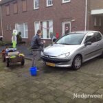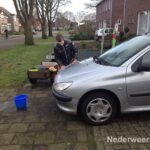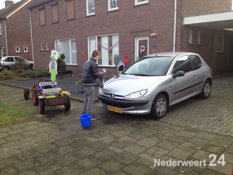Rens heeft ongeveer twintig auto’s gewassen bij hem in de buurt. Met zijn skelter bepakt en bezakt met water, spons en zeepsop is hij vanmorgen aan de slag gegaan.