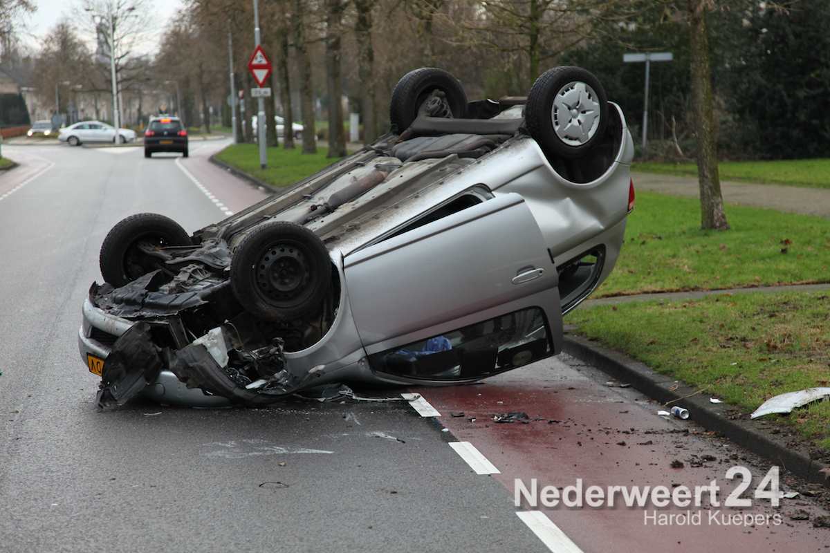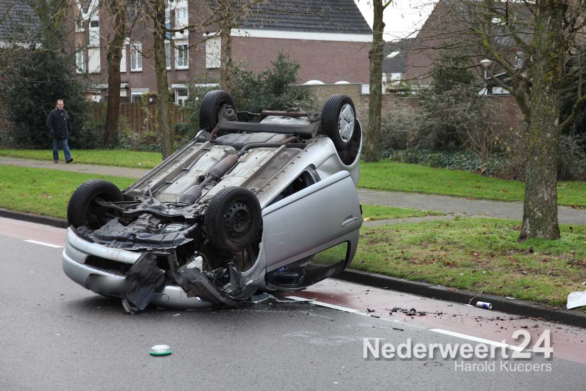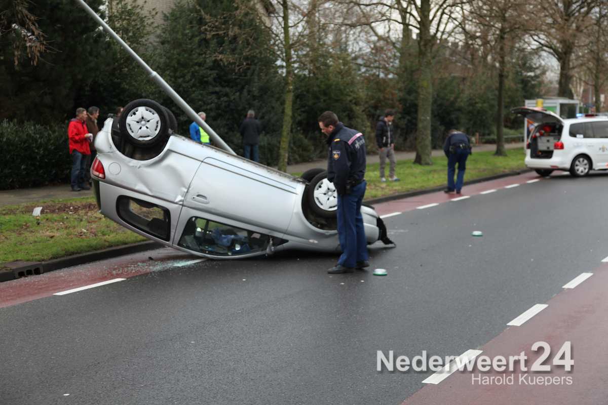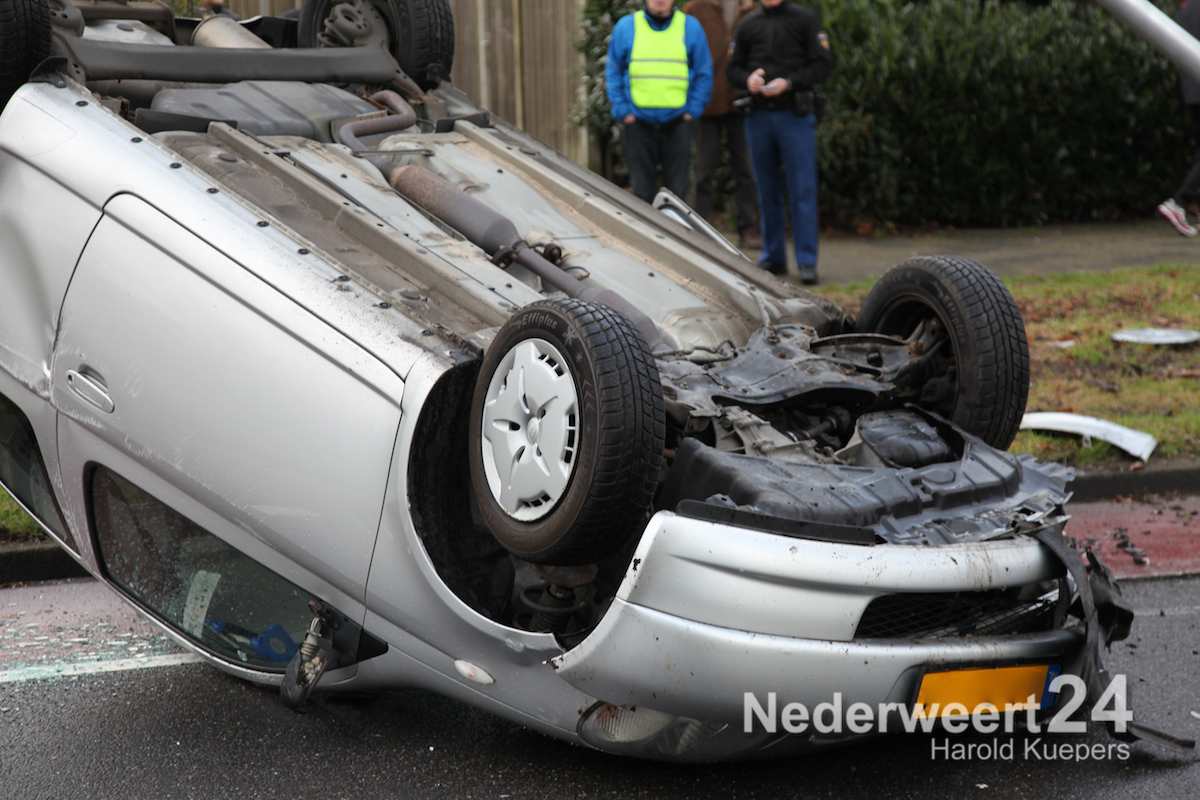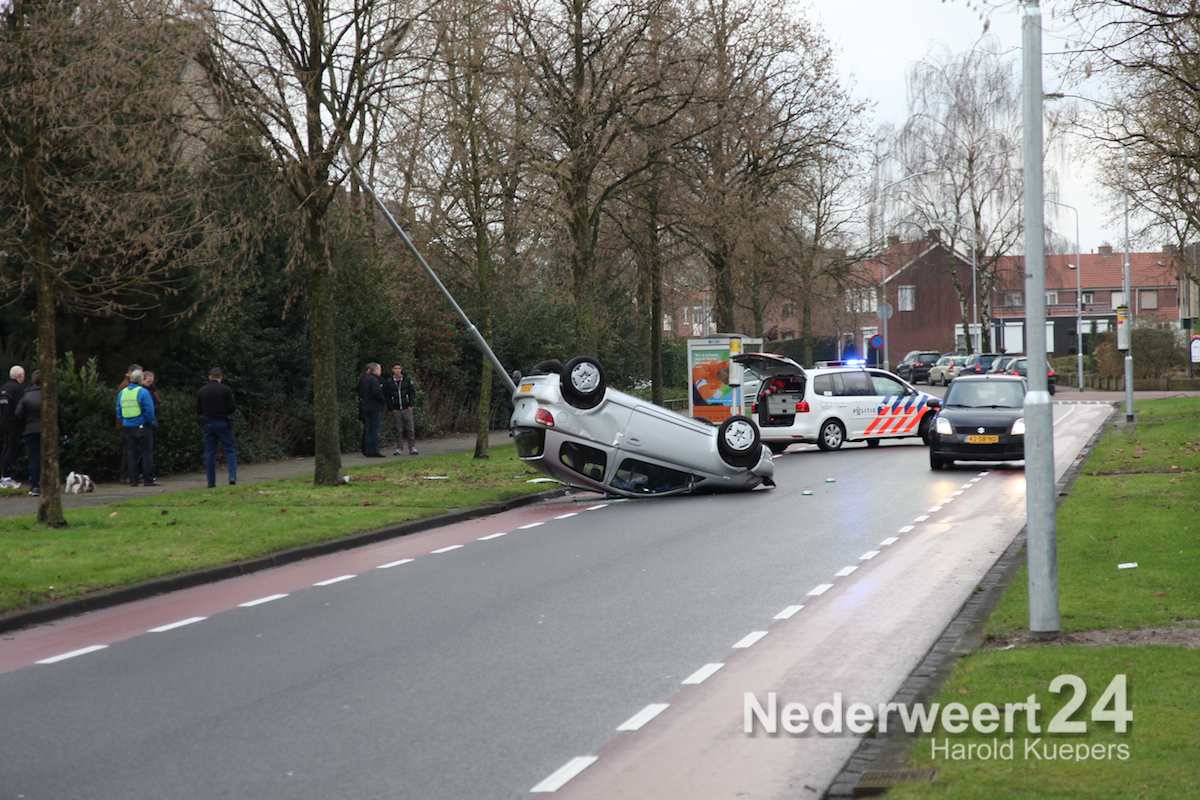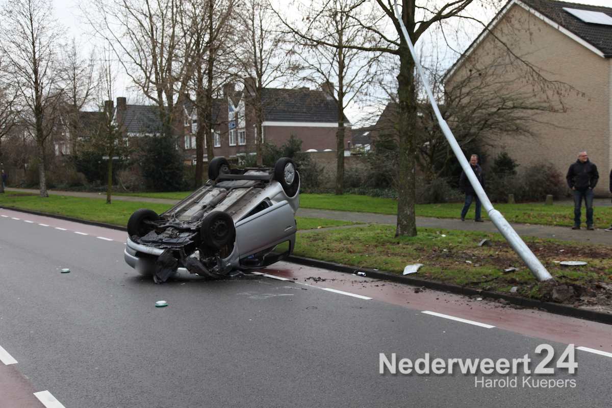 Zondagmorgen is op de Sint Jobstraat in Weert een auto over de kop geslagen nadat deze in botsing was geraakt met een lantaarnpaal.