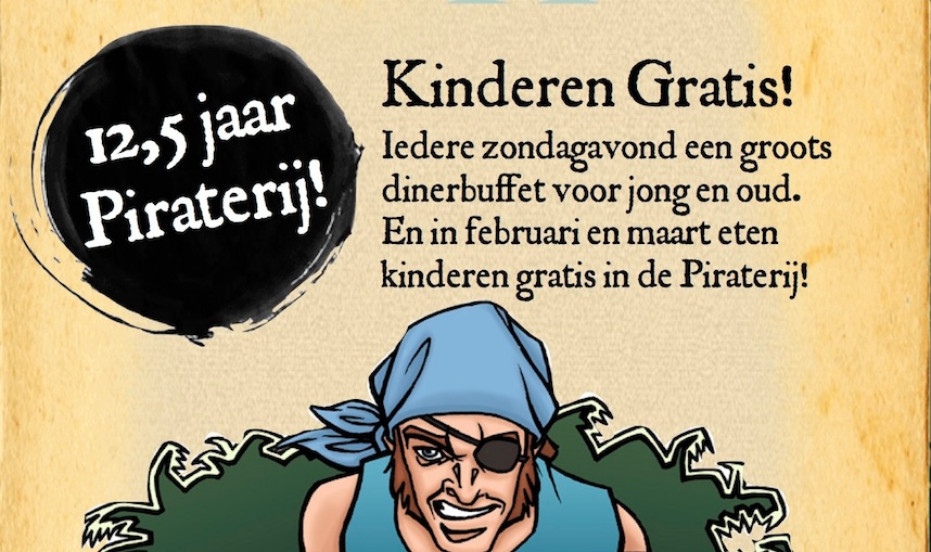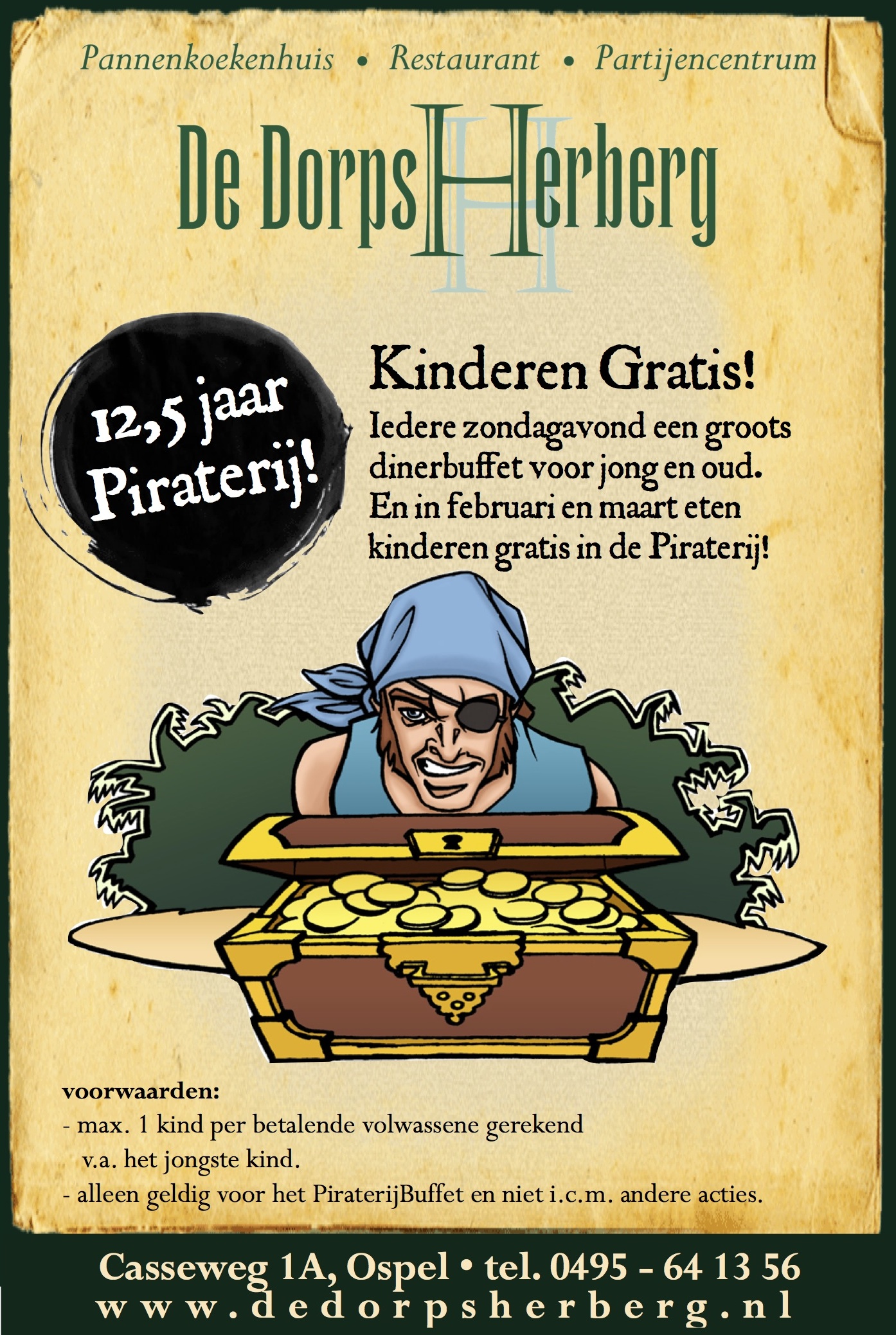 De Piraterij van De Dorpsherberg in Ospel bestaat 1 maart al weer 12,5 jaar. Dit willen ze graag vieren met hun gasten en daarom mogen kinderen in de maanden februari en maart gratis gebruik maken van het groot PiraterijBuffet op zondagavond.