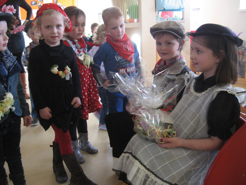 In hun mooiste boerenoutfit kwam het Jeugdboerenbruidspaar Teun en Zoey op bezoek. Er werd die dag dan ook het Boorebal gevierd! Alle kleine boertjes en boerinnetjes maakten een groenteketting en dansten de klompendans voor het piepjonge stelletje.