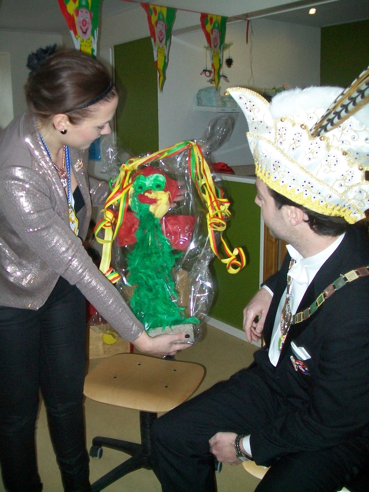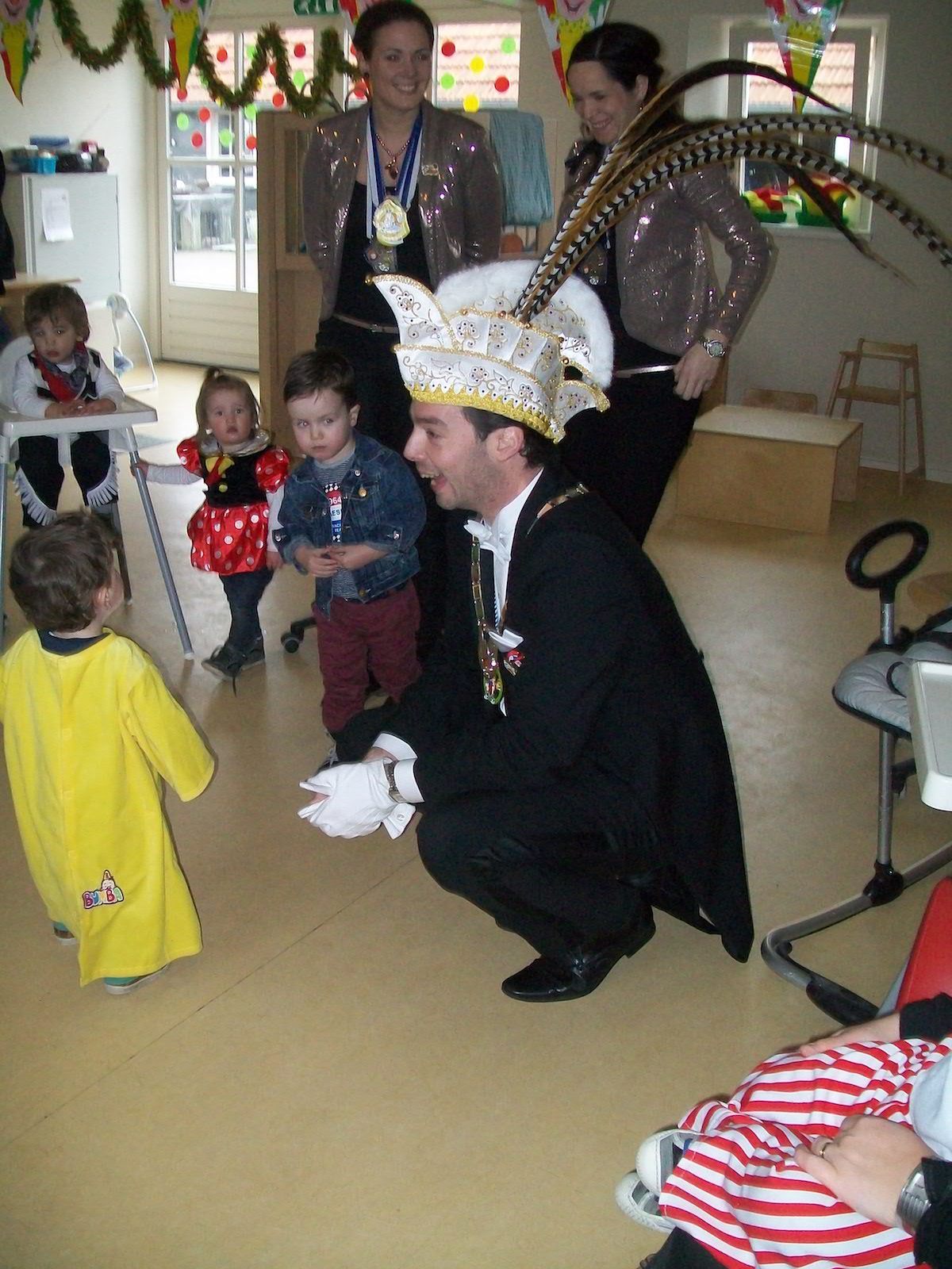 De volgende dag werd hoog bezoek van Prins Lennart met zijn vriendin Nannie verwacht. Iedereen keek zijn oogjes uit naar de mooie lange veren op zijn prachtige steek. Alle verklede kindjes deden mee met de polonaise, met de enthousiaste Prins voorop. Hij leerde iedereen: “alaaf, alaaf, alaaf”!