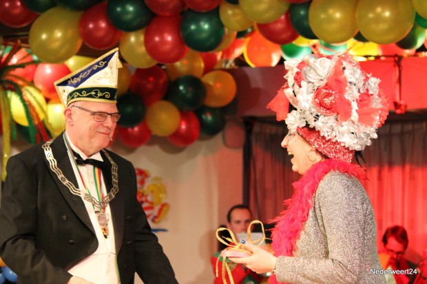Tijdens de sleuteloverdracht in het gemeentehuis van Nederweert wordt ook de “Gouwe Rienastel” uitgereikt. Dit is een prijs voor het mooiste hoedje in de zaal. Het overgrote deel waren van die hoedjes met die lange veren maar die vielen buiten de competitie. Opperpin Henk stond op het podium en liet zijn ogen speurend naar het mooiste hoedje door de zaal gaan.