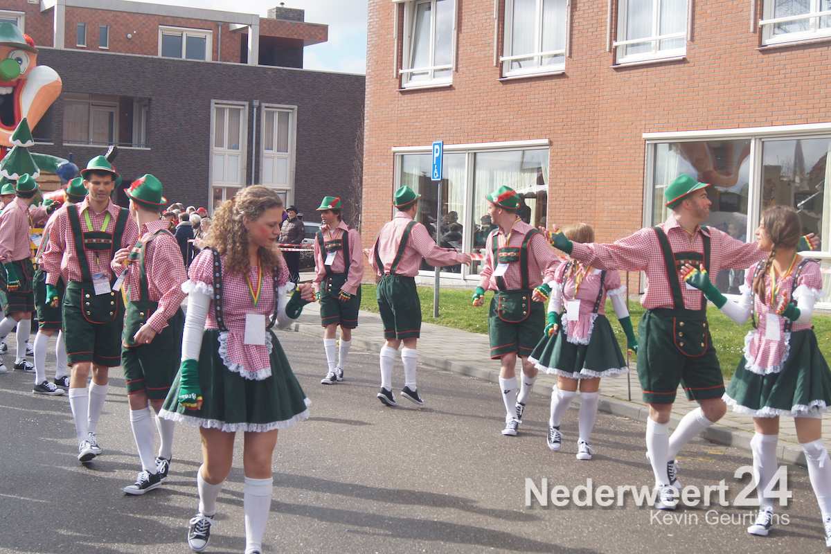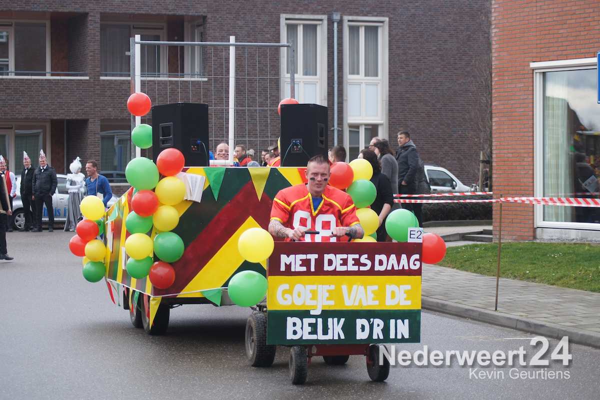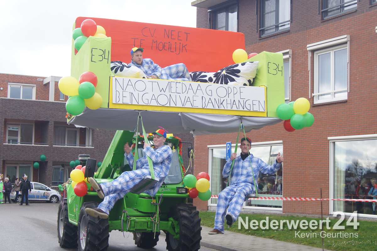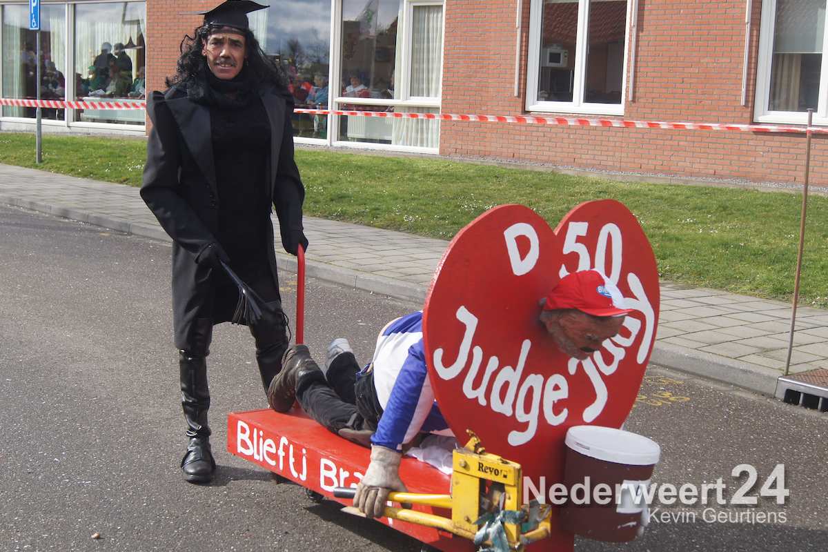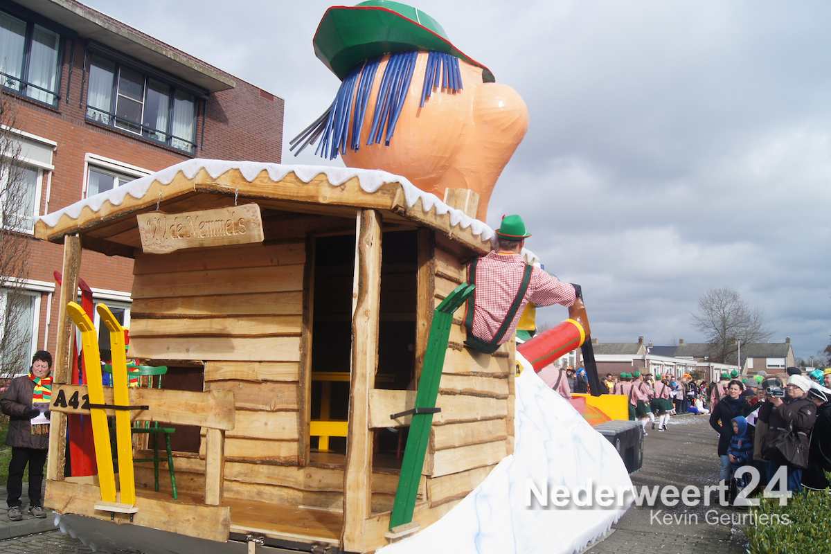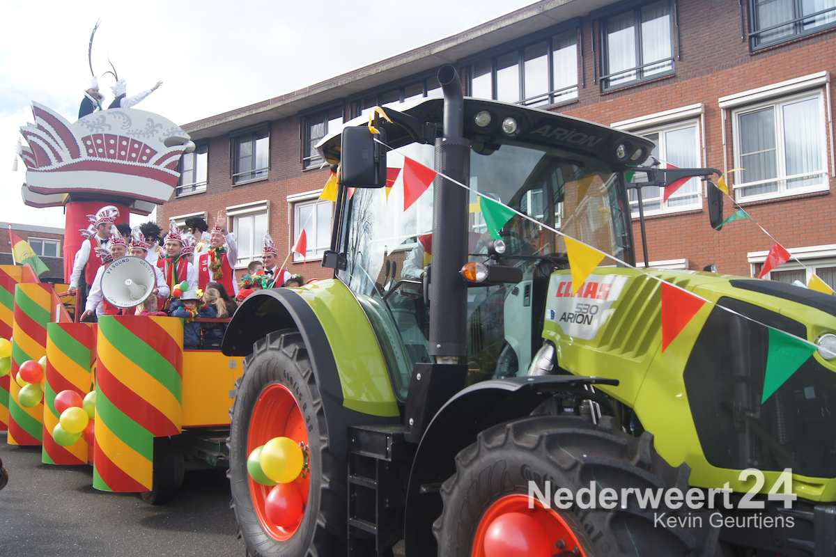 Van het Aerthijsplein vertrokken de wagens om 13:00 uur om het toegestormde publiek te vermaken met hun kleurrijke wagens. Een grote optocht want met 54 wagens hadden ze meer deelnemers dan de optocht in Nederweert.