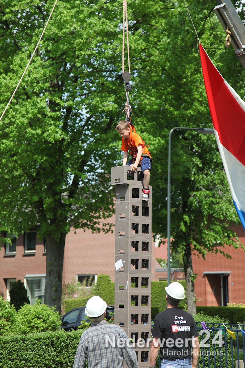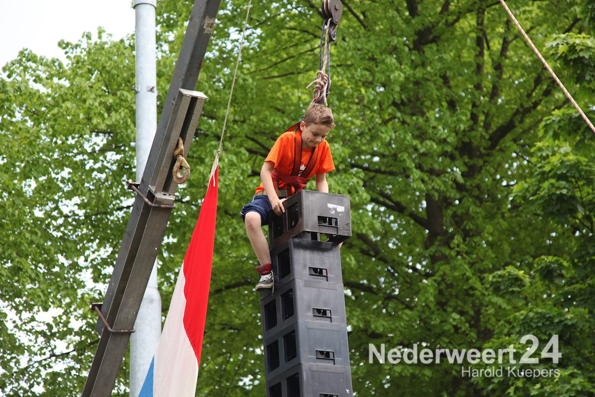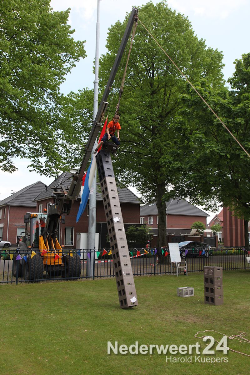 Het was er gezellig druk op de “kleine” markt. Vooral de spelactiviteiten werden goed bezocht door de kids uit de buurt. Zo konden ze op het plein “kratten stapelen”. Goed beveiligd stapelde de jeugd de kratten hoger en hoger totdat……