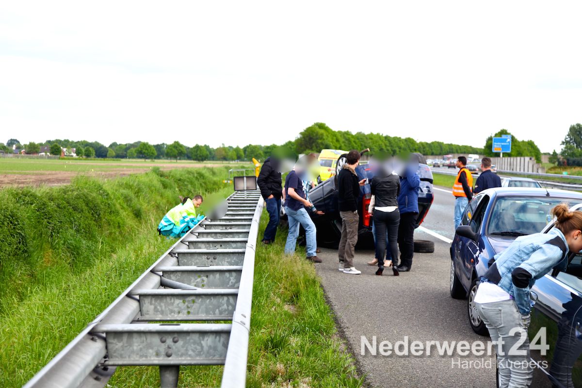 Bij een ongeval op de A2 in Nederweert is vanmiddag een personenauto verschillende keren over de kop gevlogen. De auto reed vanuit Maastricht richting Eindhoven en is net na afslag Nederweert de macht over het stuur verloren.