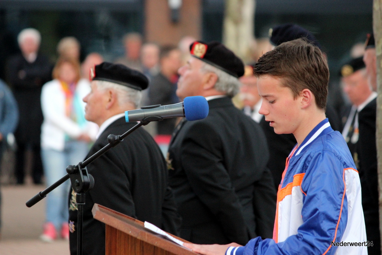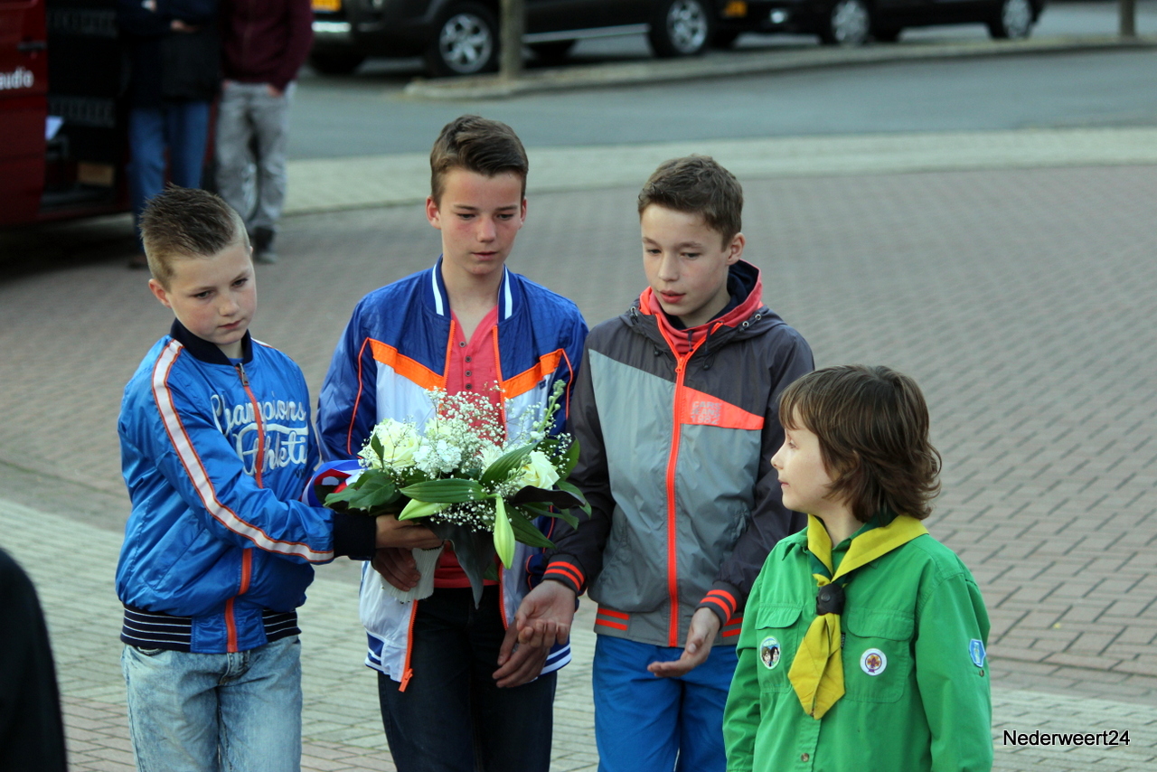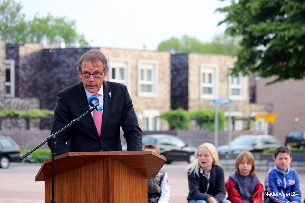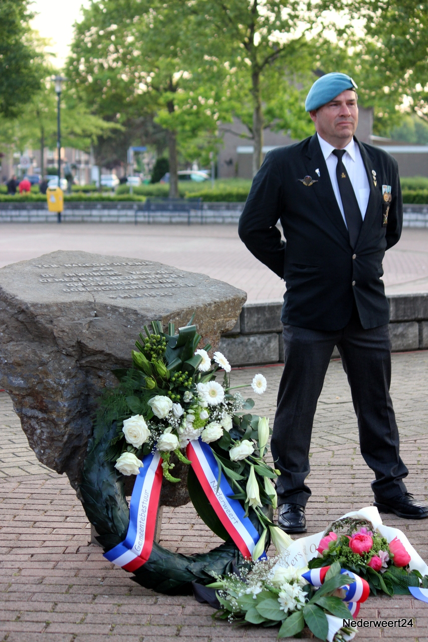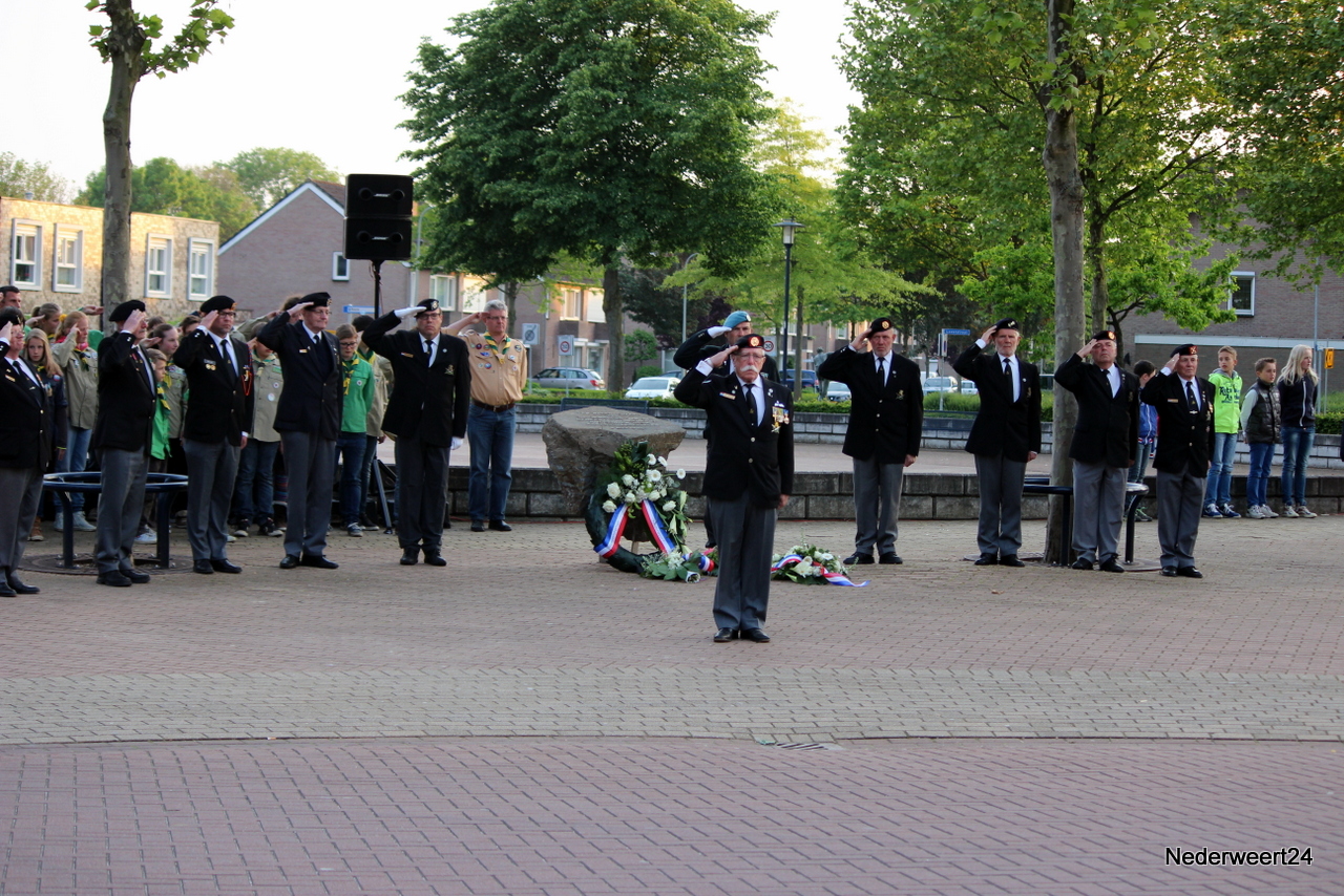 Zondagavond 4 mei 2014 werden ook in Nederweert de doden uit de tweede wereldoorlog herdacht. Op het Raadhuisplein waren genodigden en belangstellenden bij elkaar gekomen om dit moment mee te maken. Peter Stultjens hield namens het 4 en 5 mei comité een toespraak. Namens het gemeentebestuur sprak burgemeester Evers de aanwezigen toe. Ook de jeugd droeg haar steentje bij aan de plechtigheid. Drie scholieren van de Schrank in Ospel vertelden wat zij van oorlog vinden en concludeerden dat dit nooit meer mag gebeuren. Om klokslag 20.00 uur werd het 2 minuten stil.