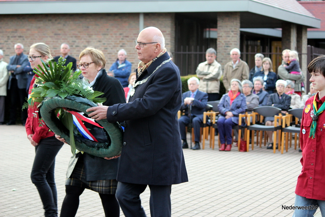 Aan het einde van deze plechtigheid werden er kransen gelegd bij het monument op het Raadhuisplein. Namens de gemeente Nederweert was deze eer aan burgemeester Evers met zijn echtgenote. Daarna volgden er nog kransen namens het 4 en 5 mei comité, De Bond van Wapenbroeders en de scholieren van de Schrank in Ospel. De bijeenkomst eindigde met een opdracht voor de jeugdige aanwezigen: “Hou deze herdenking in stand”.