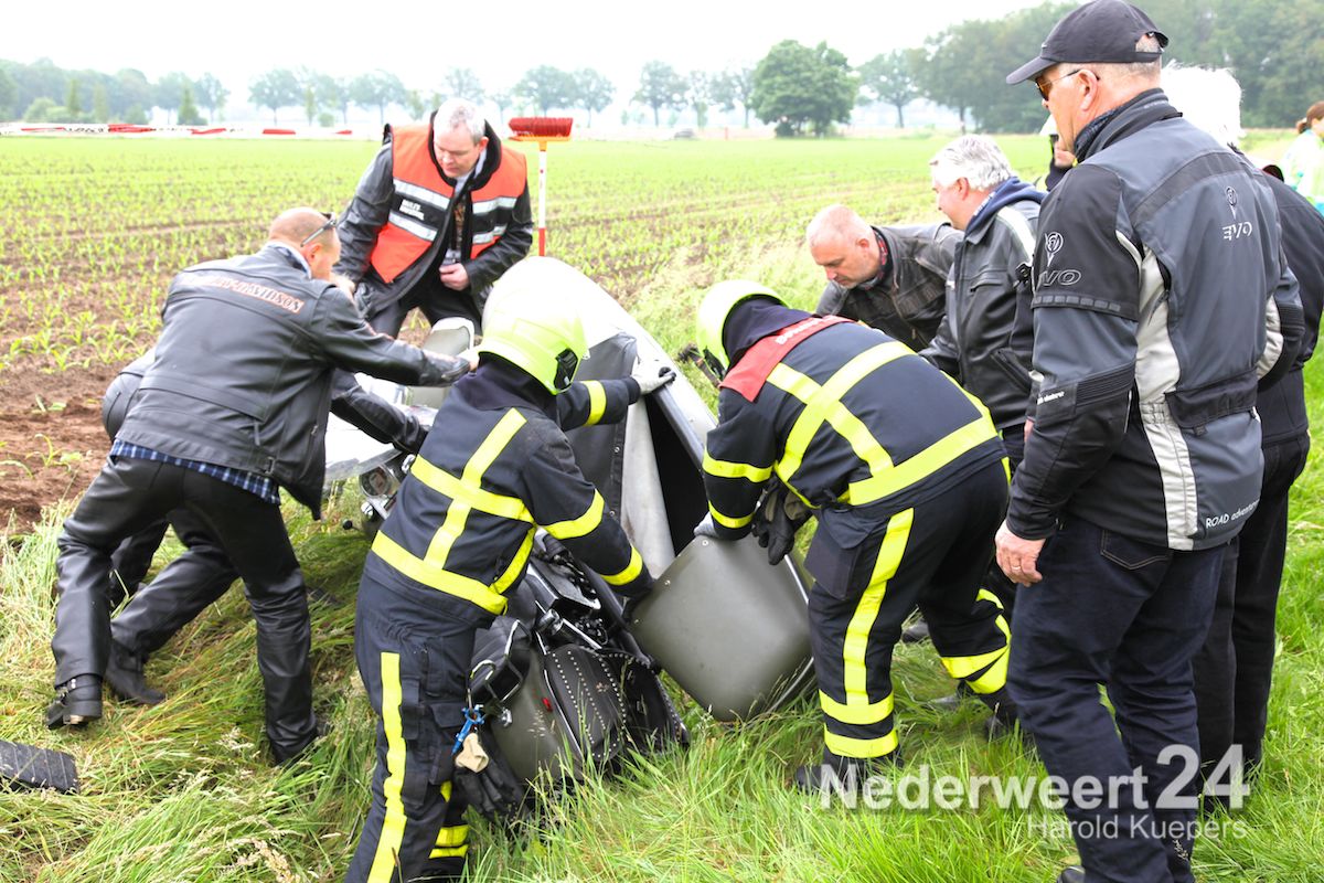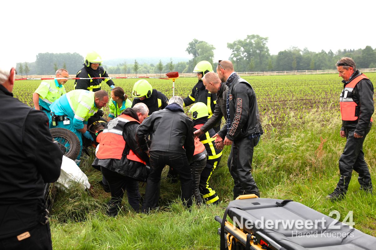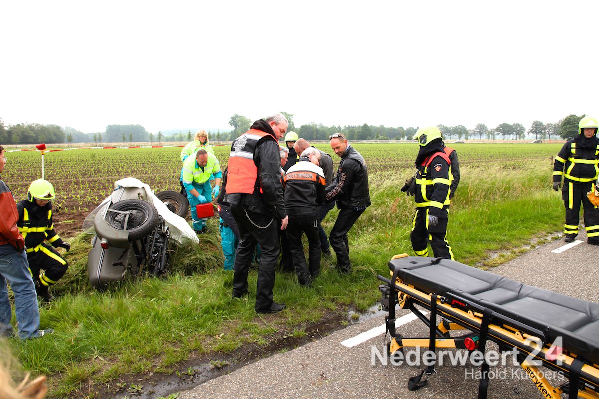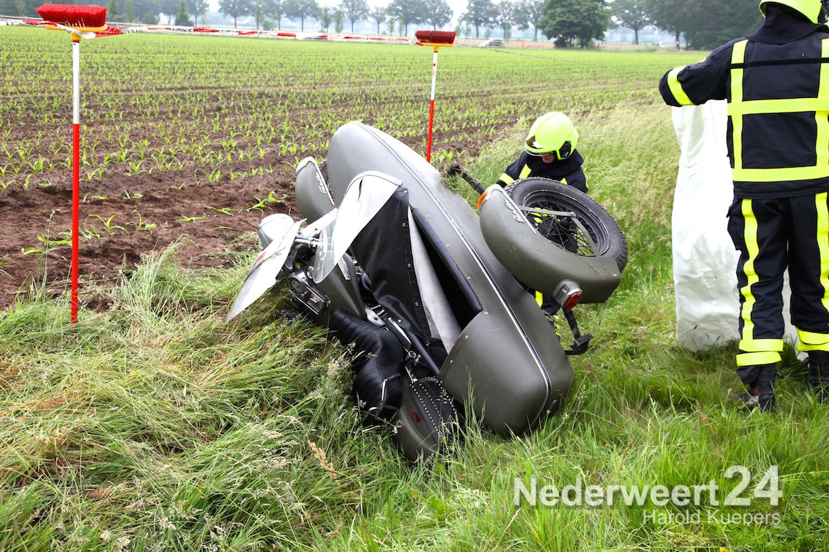 De motor met zijspan reed voorop in een groep motorrijders van zo’n 20 motors. Ze waren een Hemelvaart rit aan het rijden. In de zijspan zat zijn dochter goed in de gordels en achterop zat zijn vrouw. Door onbekende oorzaak is de motorrijder de macht over het stuur verloren en langs de kant van de weg in de sloot geraakt. Vrouw en kind zijn met de schrik vrijgekomen. De bestuurder van het zijspan lag achter de motor en heeft zware verwondingen aan zijn been. Volgens meerdere motorrijders reden ze niet hard. “Het blijft moeilijk om een motor met zijspan te besturen, maar hij had veel ervaring” aldus een bevriende motorrijder.