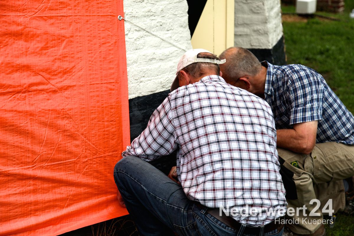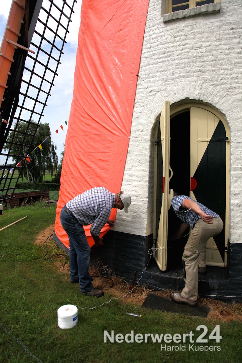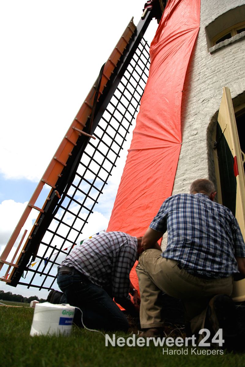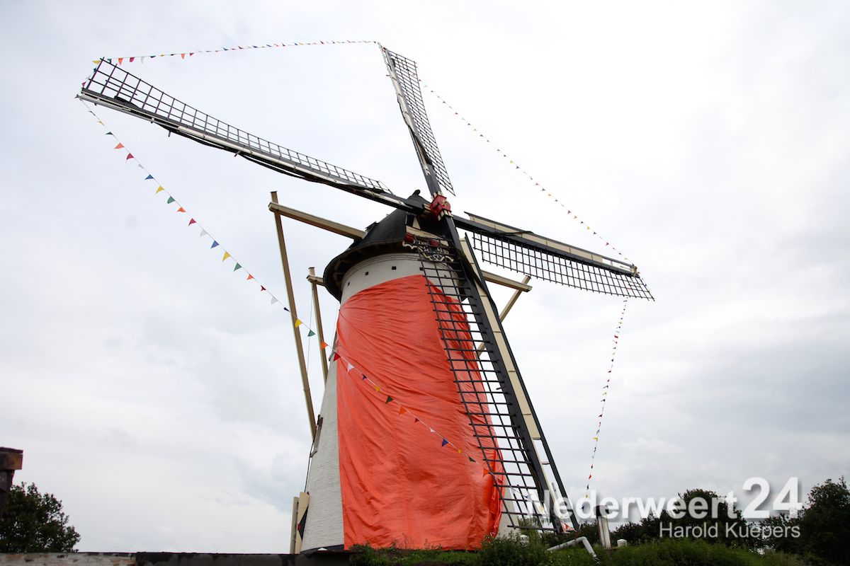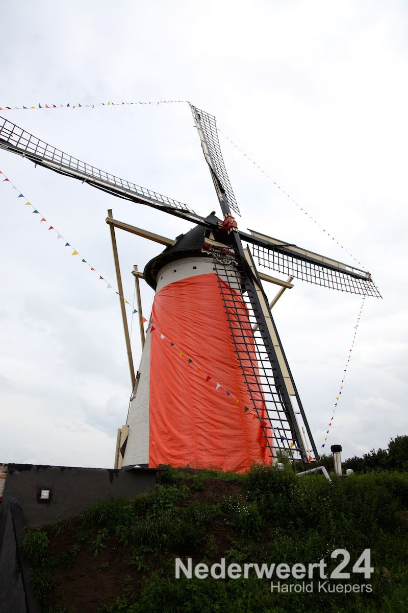 “Als molenaars moeten we altijd blijven proberen om een bijdrage te leveren aan de gemeenschap”, aldus molenaar Piet Heldens. Molen de Windlust is vanuit de snelweg te zien en dus een mooie plek om Nederweert oranje te kleuren. “Nog even de molen in de ‘vreugden-stand’ plaatsen en we zijn klaar voor het WK!”.