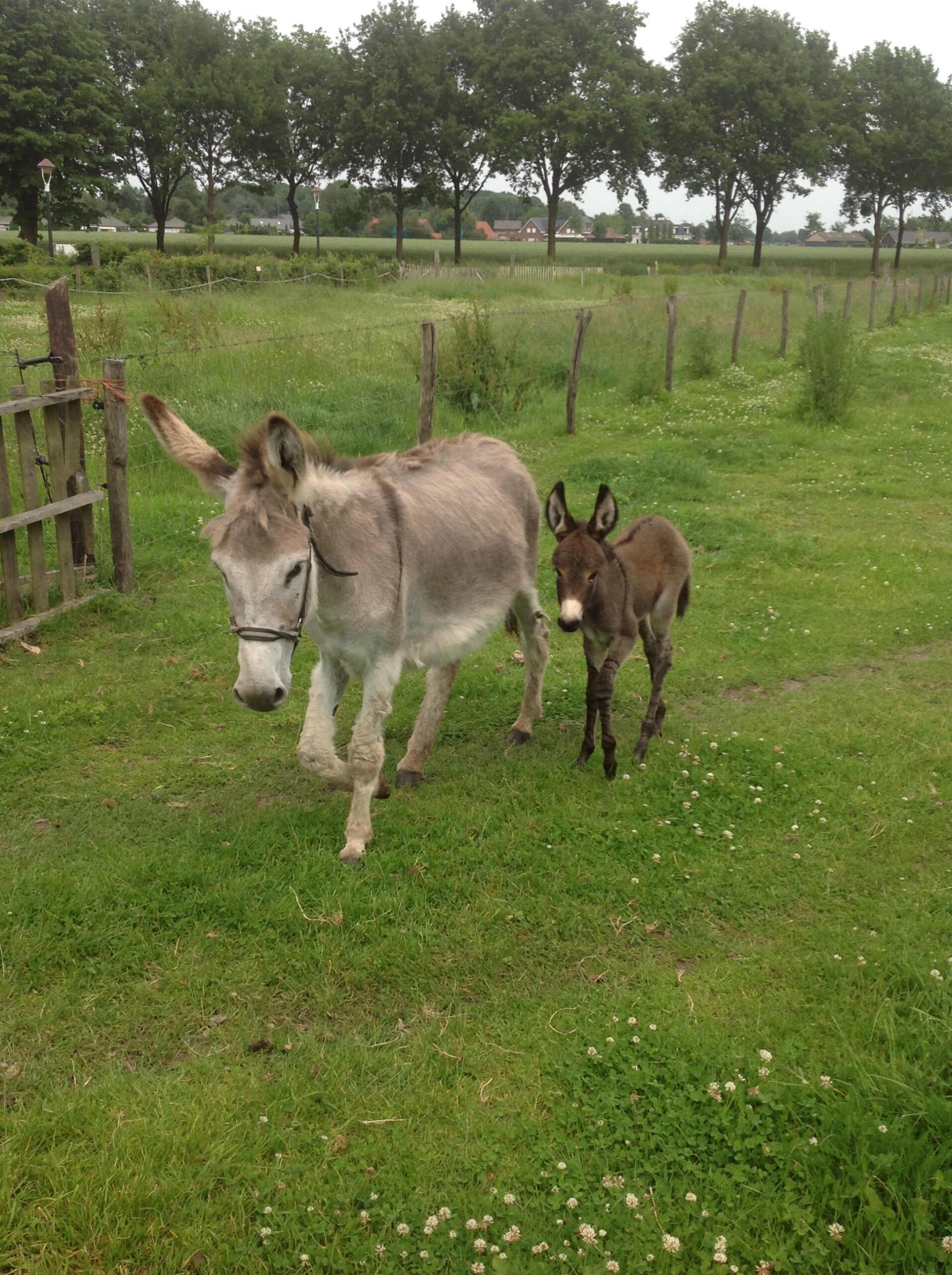 De jonge geitjes zijn al heel ondernemend en actief. Ze springen op de stenen en huppelen vrolijk in het rond. In de loop van de week werden de kinderen toch wel ongerust. “Wanneer komt de baby ezel nu?” vroegen ze dagelijks. Vrijdag was dan eindelijk de grote dag. De kleine baby ezel werd geboren. Iedereen vond en vindt het reuze spannend hoe alles in zijn werk gaat. Hoe drinkt de kleine merrie bij mama? Hoe huppelt ze door de wei en gaat ze ook op avontuur uit…